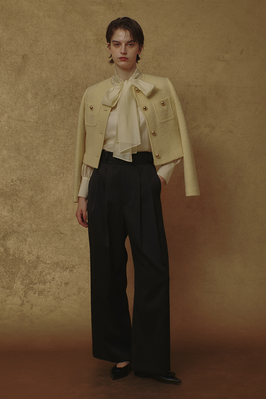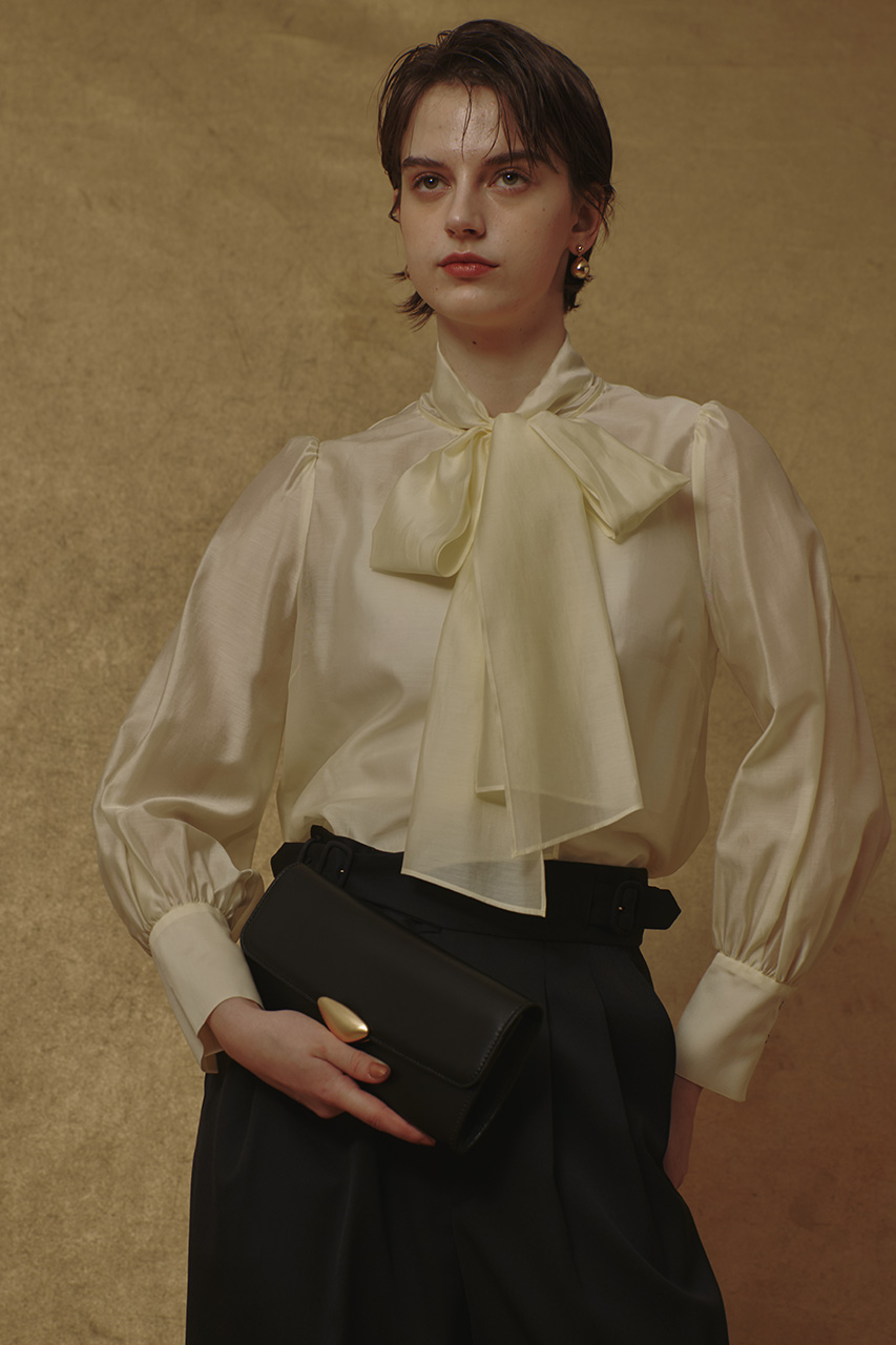 ソフトオーガンジーの絶妙な透け感が魅力のリボンブラウス。シンプルなスタイリングに華やぎをプラスしてくれます。マニッシュなボトムスに合わせたMIXスタイルがおすすめ。