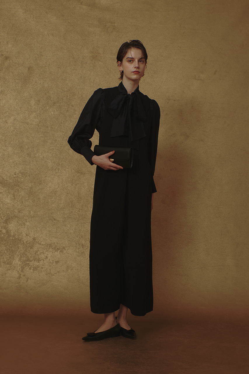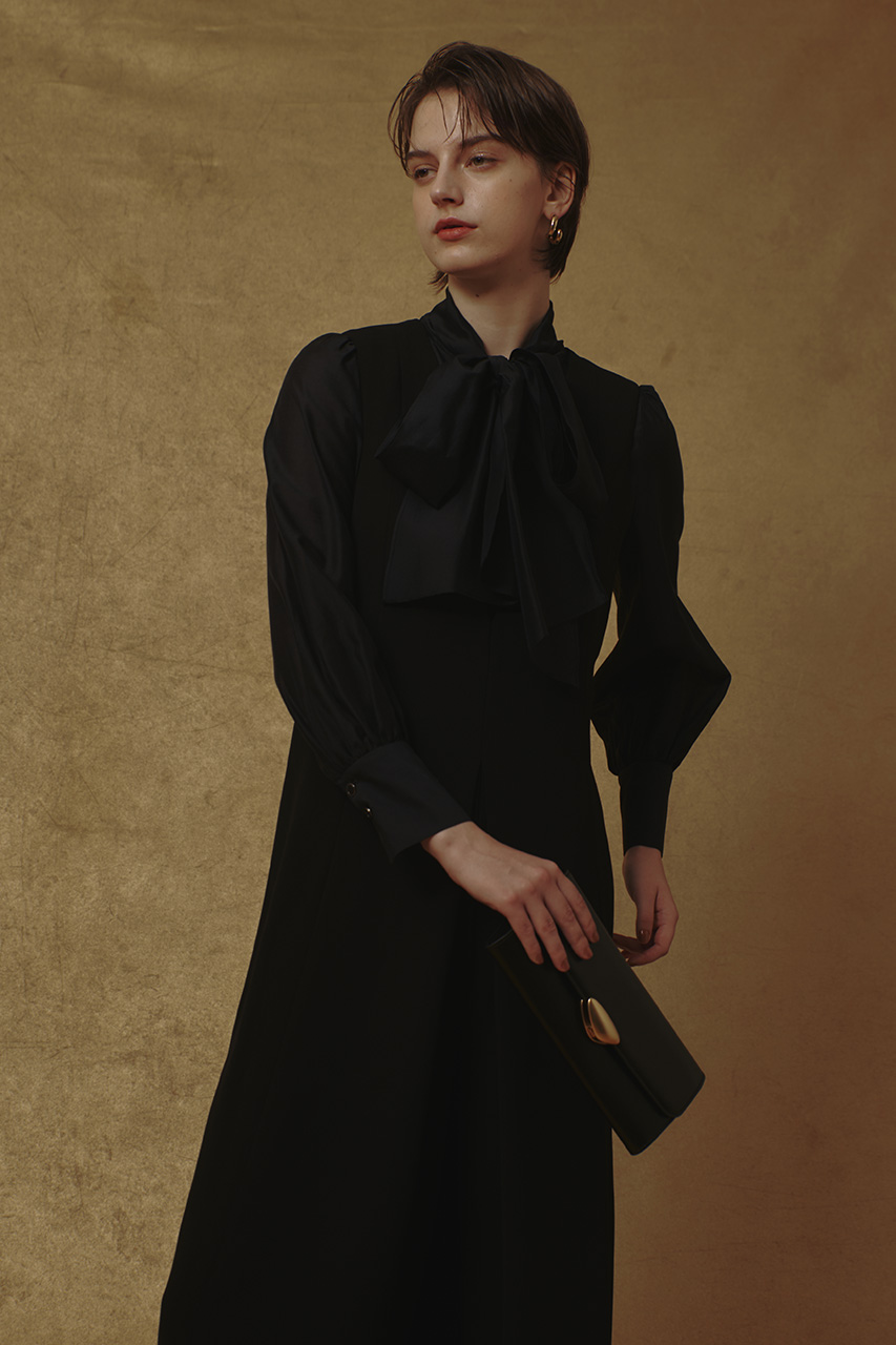 異素材のドッキング、フィットアンドフレアのシルエットで1枚でスタイリングが完成。デコルテを美しく魅せてくれるネックラインはアクセサリーの華やかさをより引き立たせてくれます。