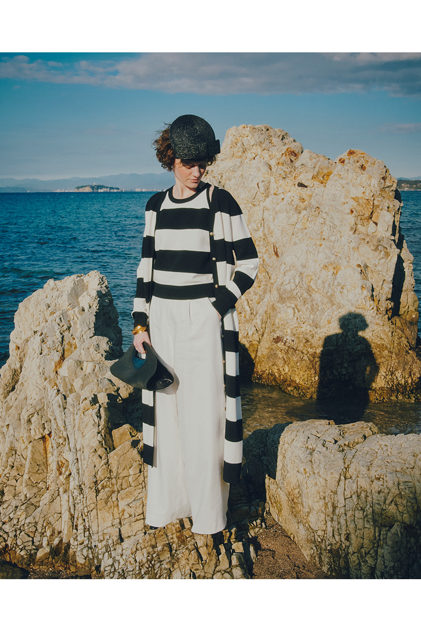 インパクトのある太めのピッチがポイントのボーダー。ロングカーディガンはワンピースとしても着用でき、抜け感のあるリラクシーなスタイリングが完成。タックトップとのアンサンブルコーデもおすすめ。