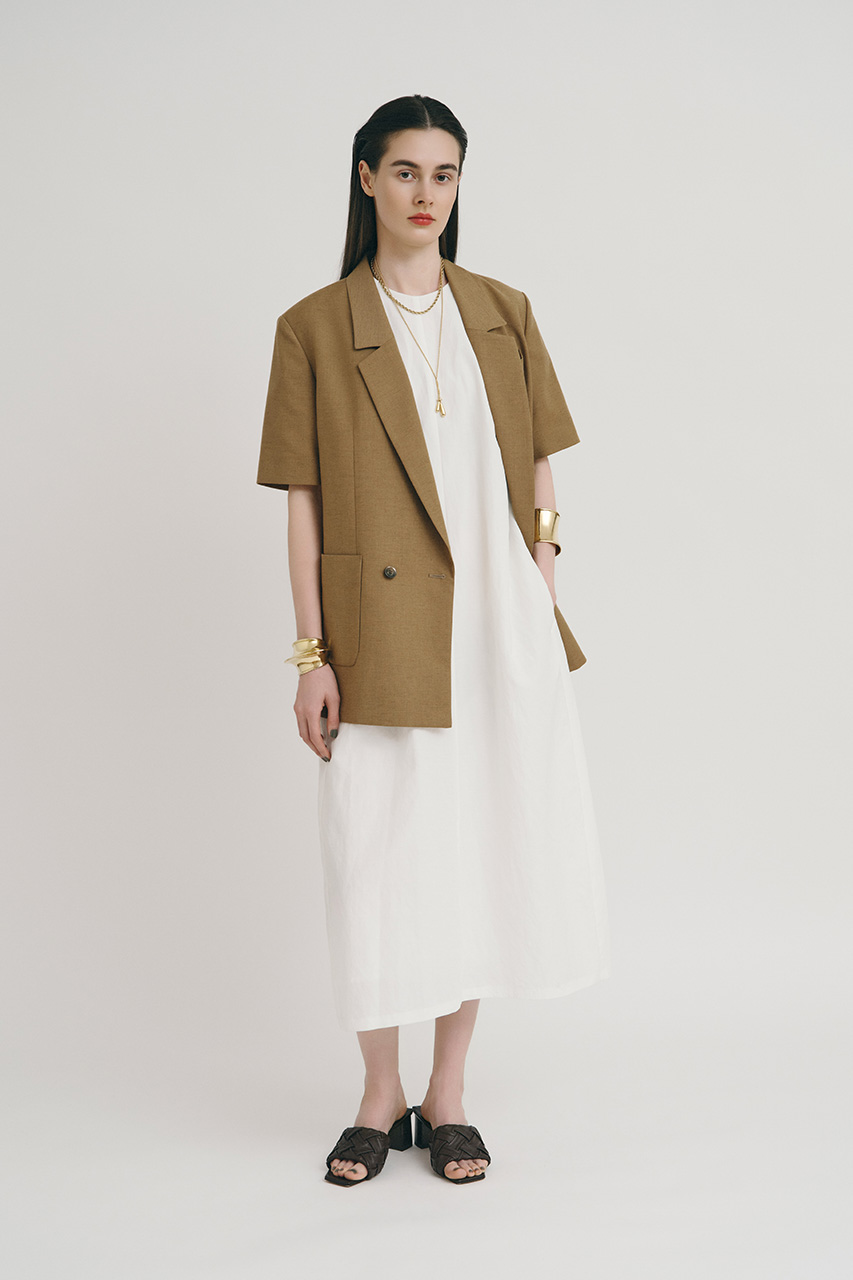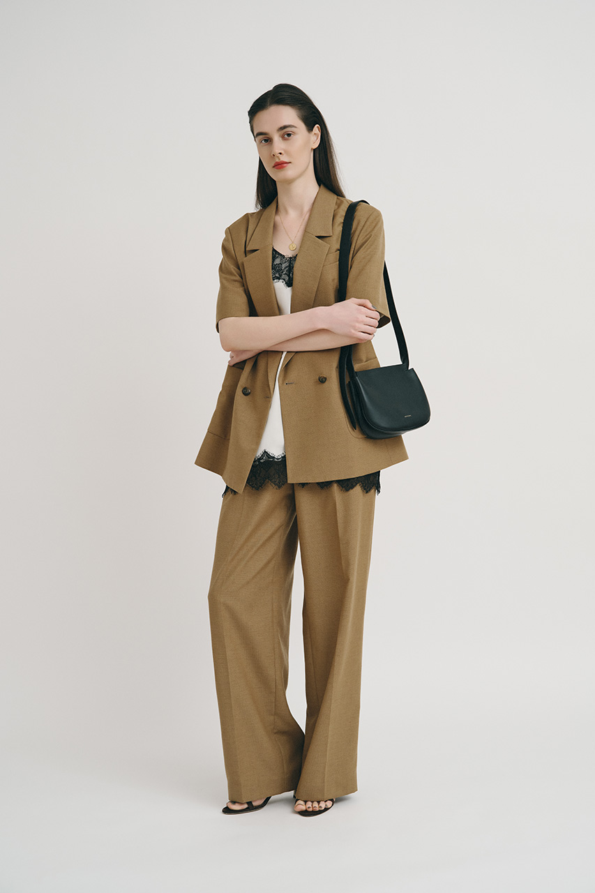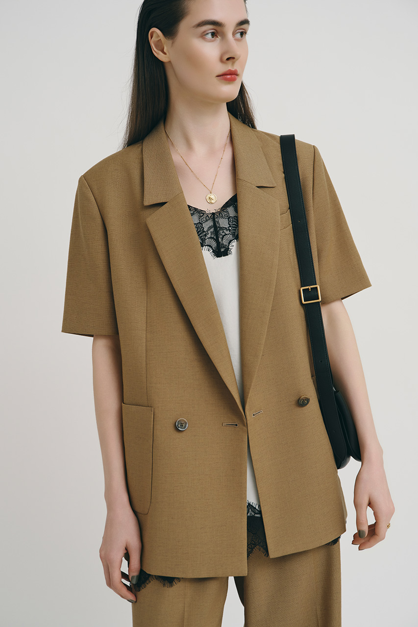 リネン混のサラッとした風合いながらシワになりづらく、オフィスでも大活躍してくれる、半袖ジャケットのセットアップ。インナーにはレースキャミソールをしのばせて甘辛Mixに。レディなワンピースとも相性◎