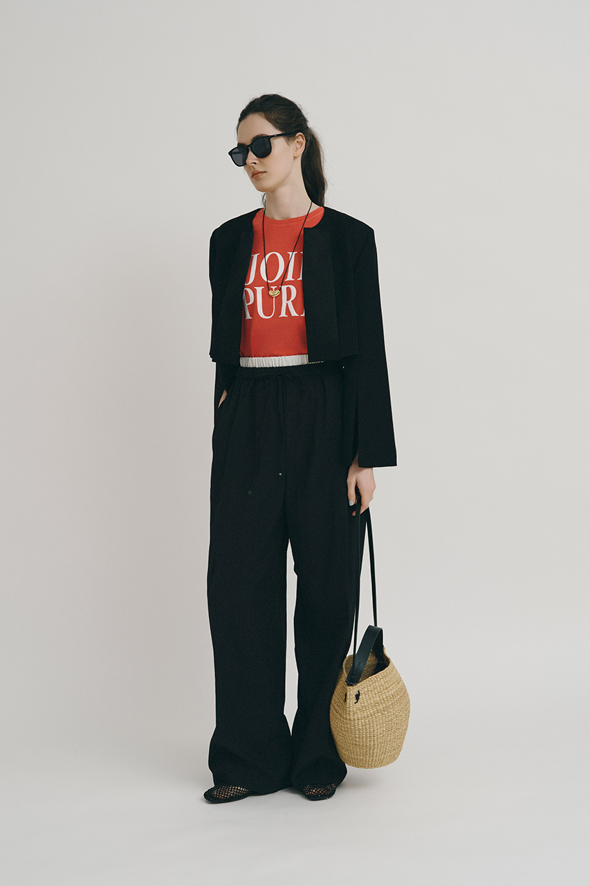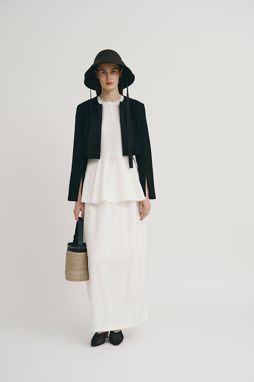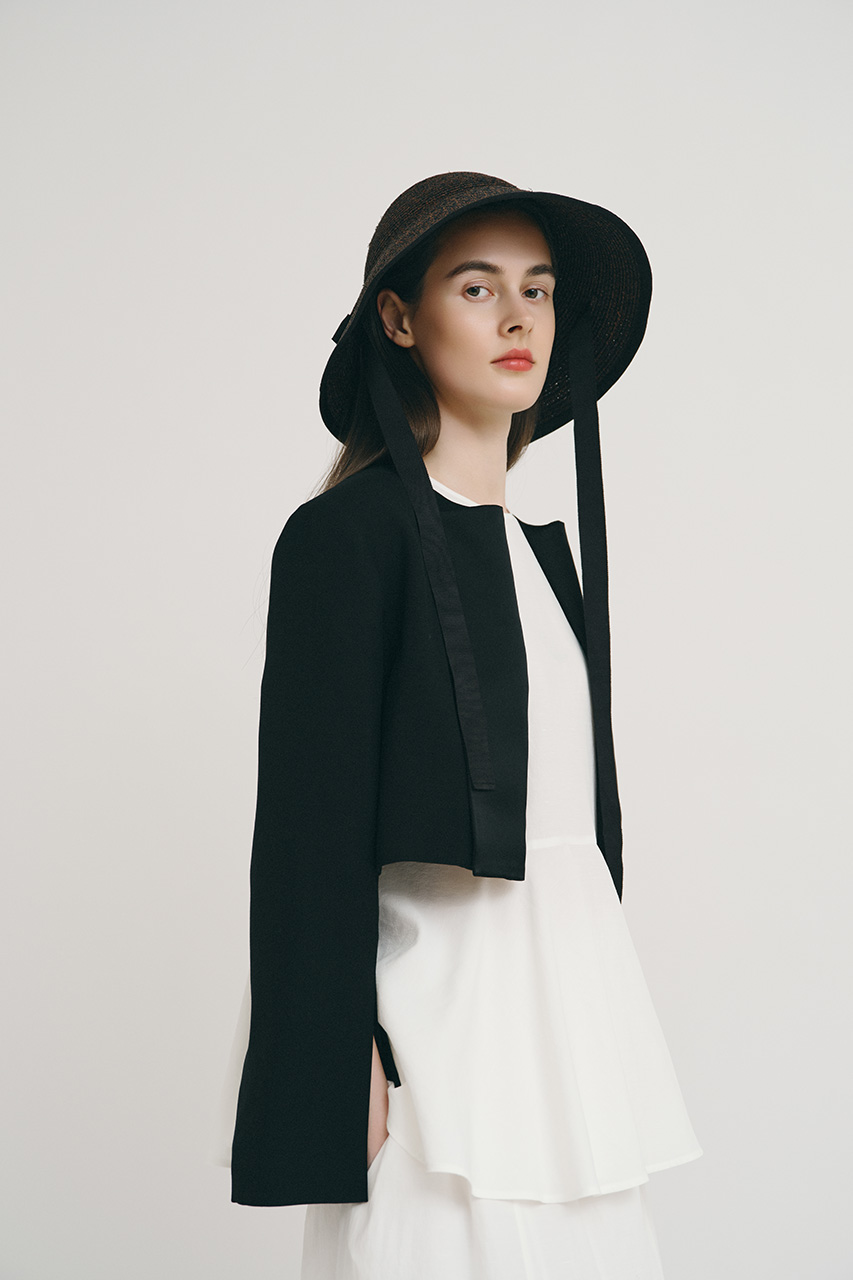 袖口に入った深いスリットでケープのように広がるスリーブラインが印象的なボレロジャケット。華やかで優雅な品格が漂う一枚は、普段使いはもちろん、フォーマルなシーンでも大活躍。ペプラムブラウス×スカートの可憐なセットアップで洗練されたモノトーンスタイルが完成。