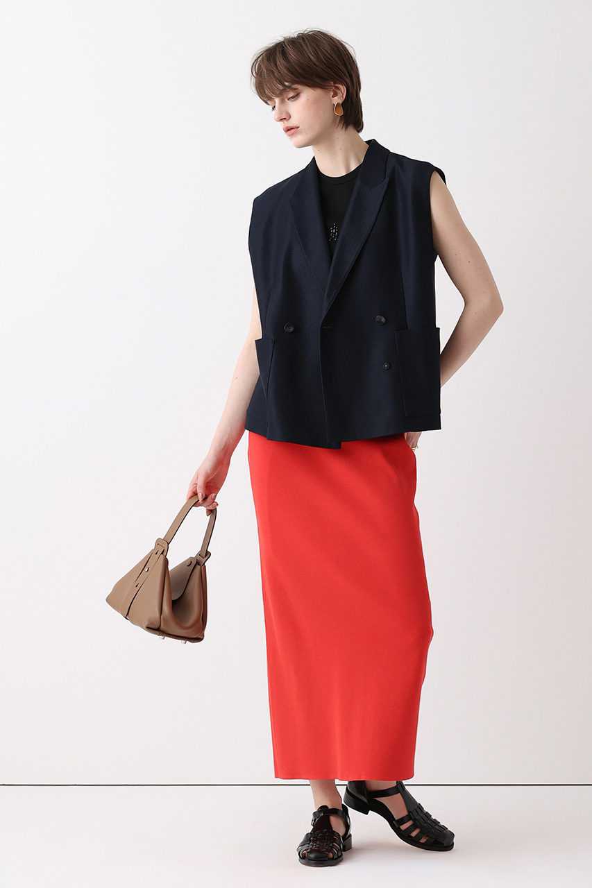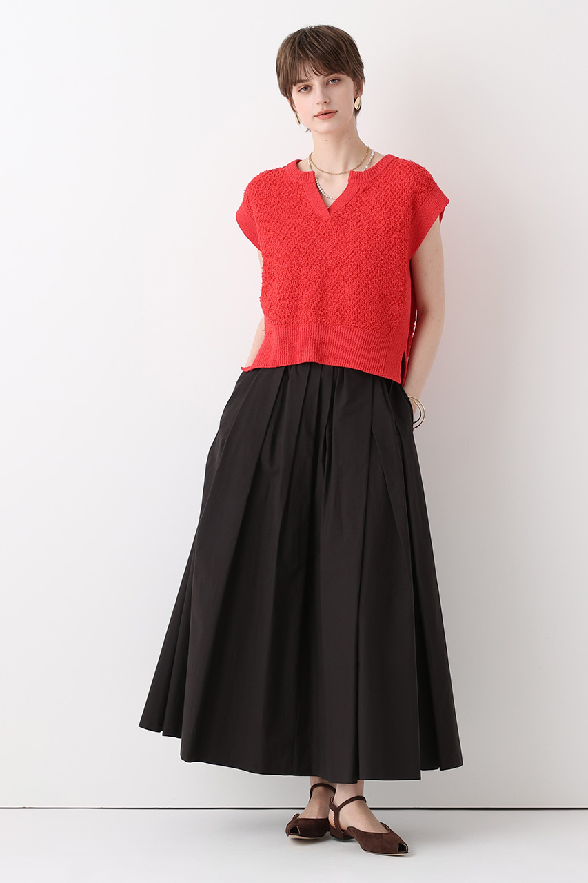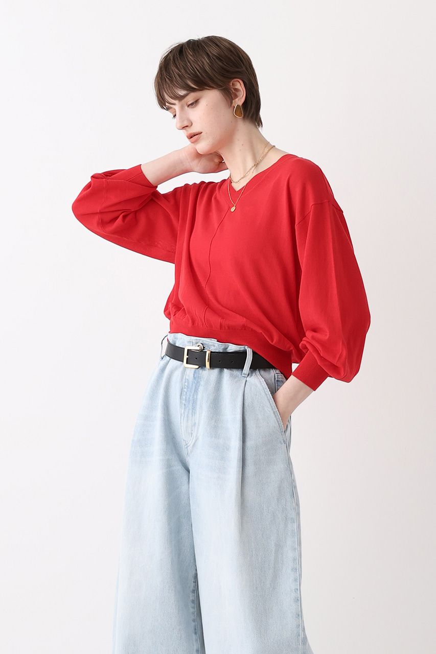 鮮やかなレッドはトップスで取り入れるのが旬。ブラックとの組み合わせは洗練された着こなしに。