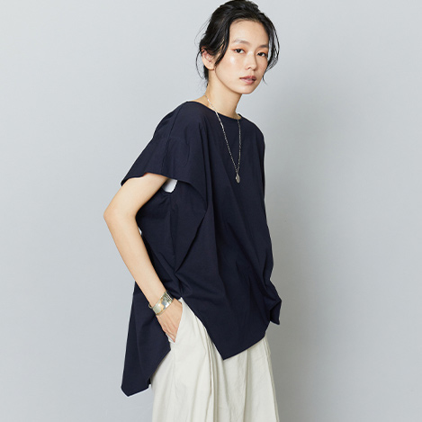 毎年定番のカットソーは透けにくく、体のラインを包んでくれるのが人気のポイント。折り返した袖口から流れるようなシルエットが女性らしいトップスは、着る人を引き立ててくれる名品です。