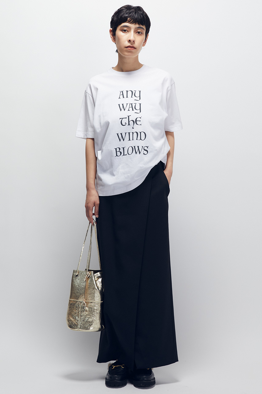 「Anyway the Wind Blows」”それでも風は吹く”のロゴが目を惹くプリントTシャツ。