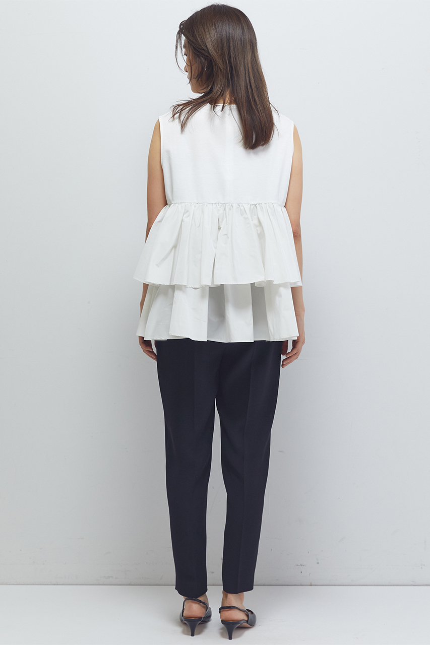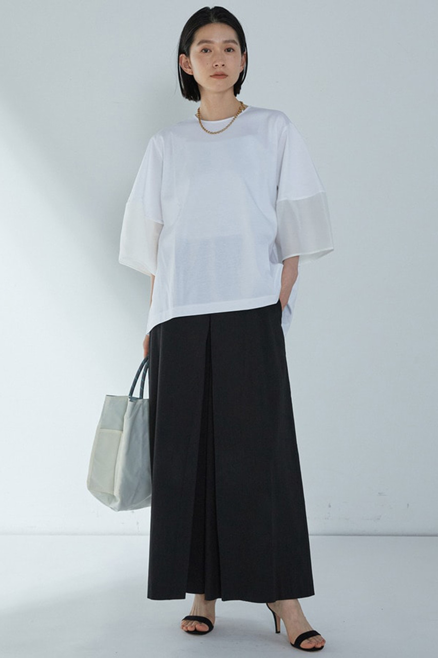 カットソー×シアーオーガンジー生地を重ねた、異素材コンビトップス。