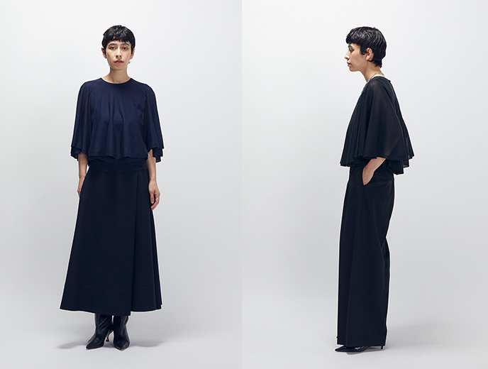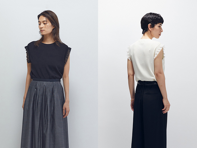タンクトップにケープをレイヤードした、清涼感のあるニット。