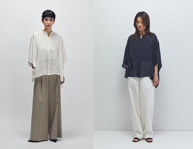 ポリエステル100%のシアー素材を使用したバンドカラーのマントブラウス。