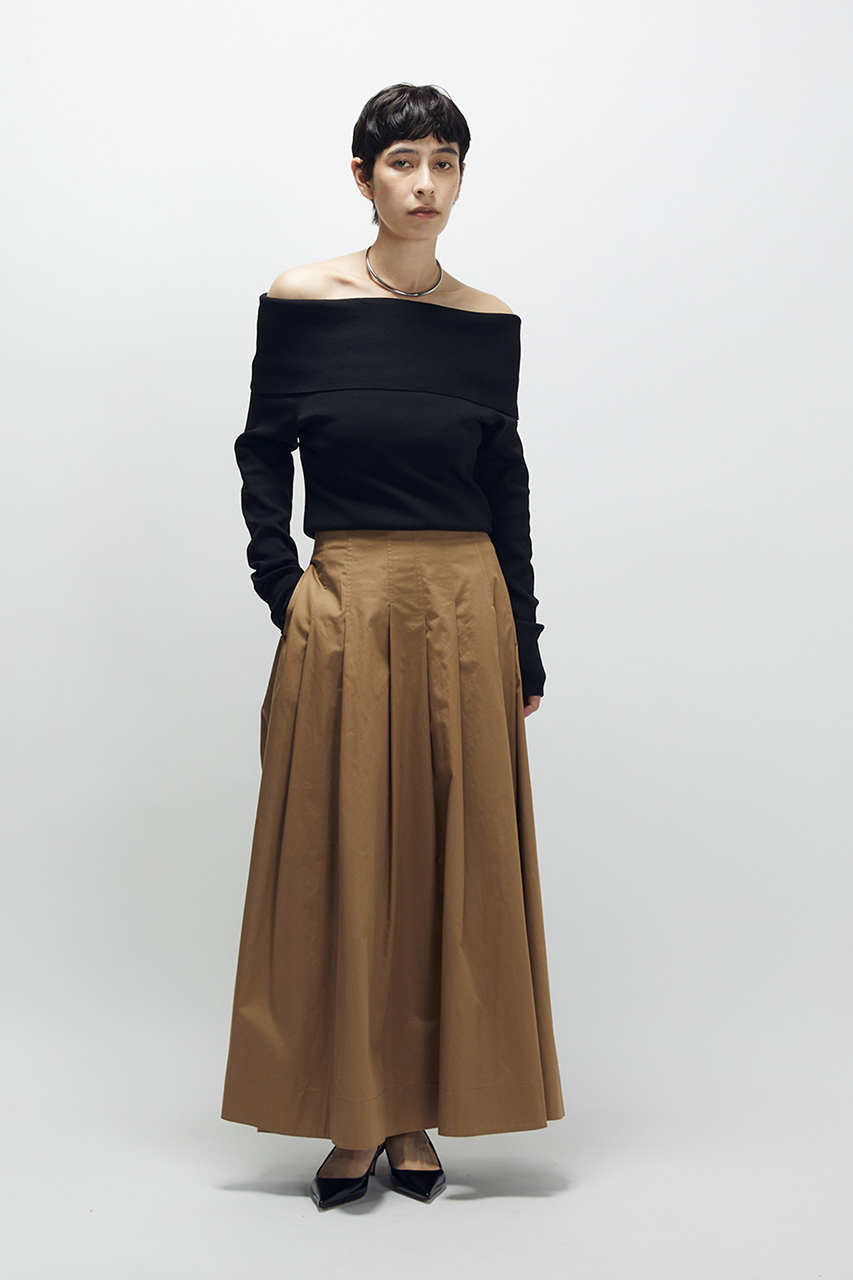 低めのウエスト位置から広がる,、分量感たっぷりのスカートがポイントに。