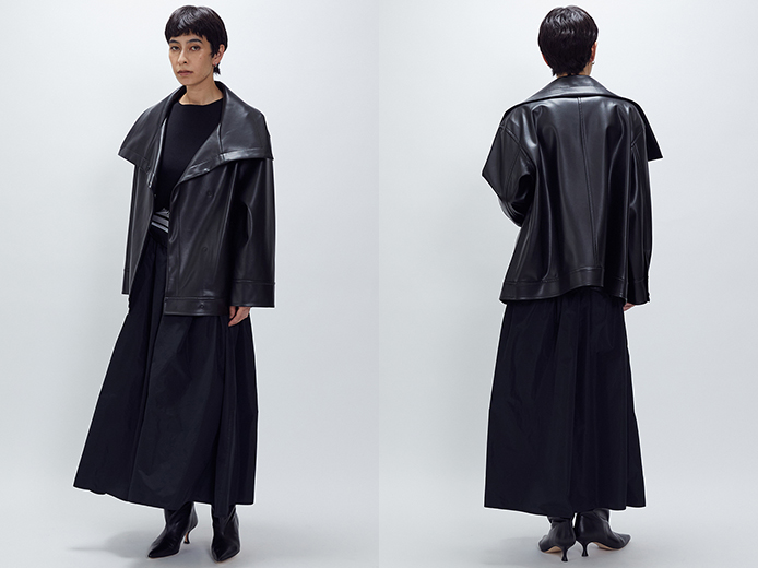 フェイクレザーならではの軽さとしなやかさを活かし、上品でモダンな雰囲気に。