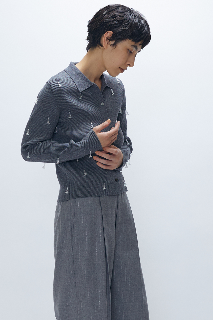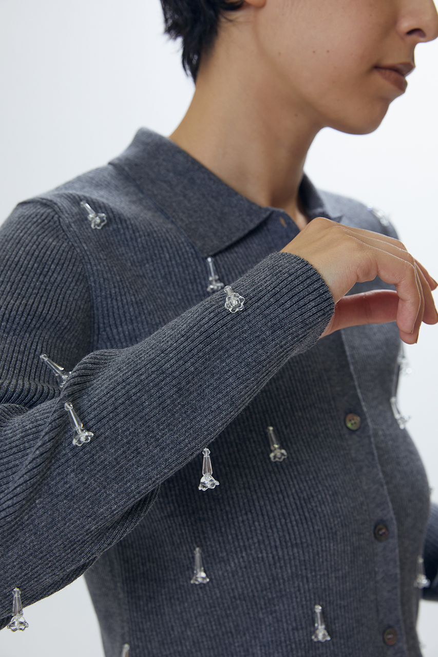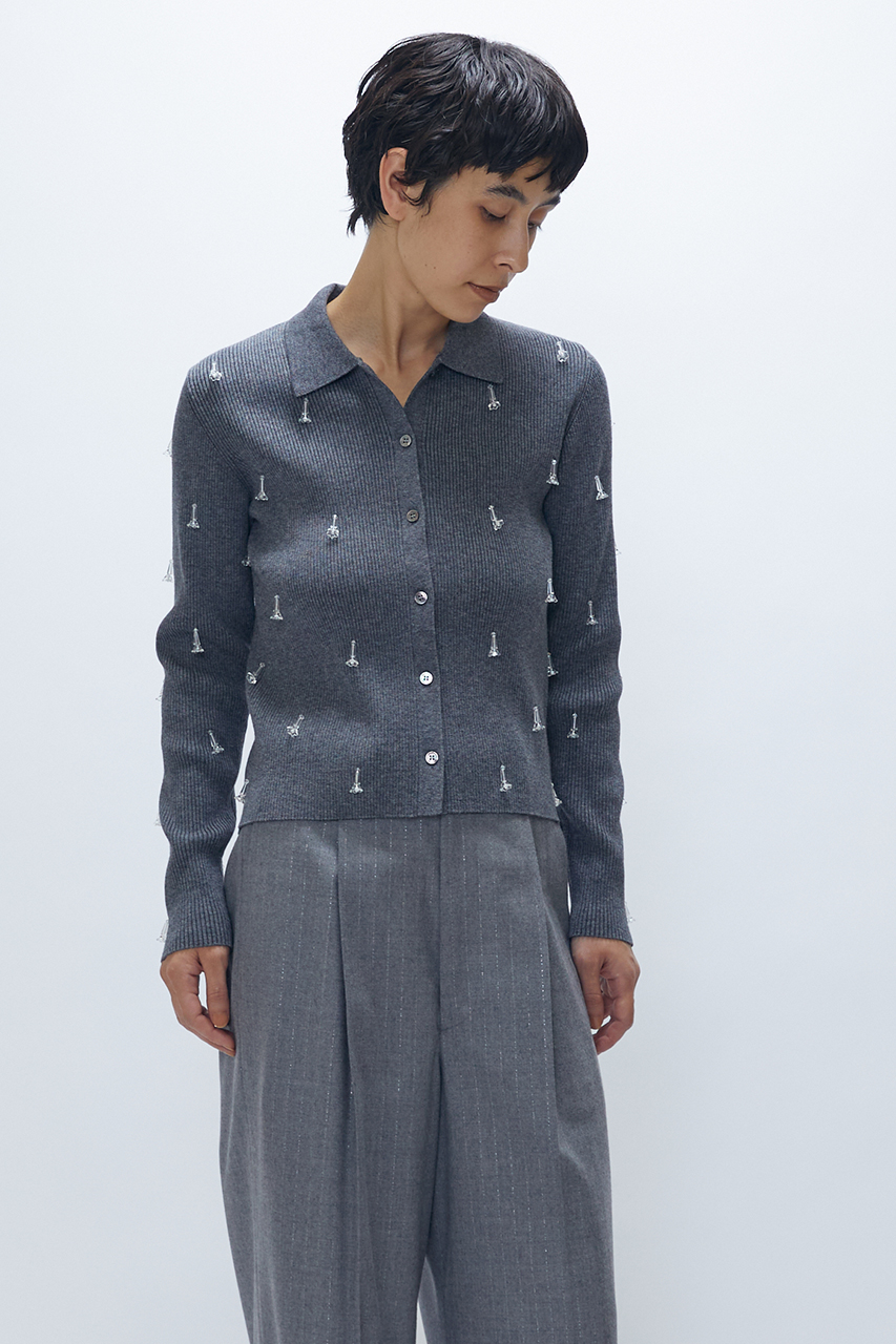 フロントと袖にあしらったビジューパーツが映える、モードで華やかなニットシャツ。
