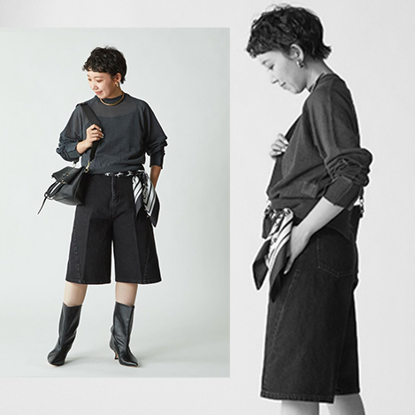 デニム素材のハーフパンツは今はロングブーツ、春先にはソックスやスニーカーと合わせて長く着回しが効くアイテム!