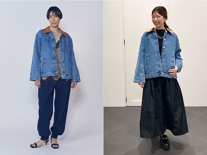 異素材切り替えの衿デザインが着映えるデニムブルゾン。