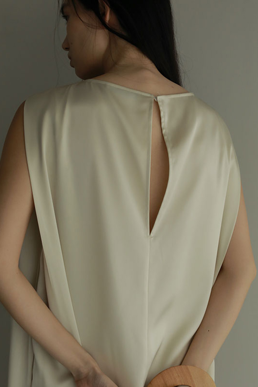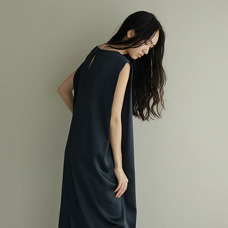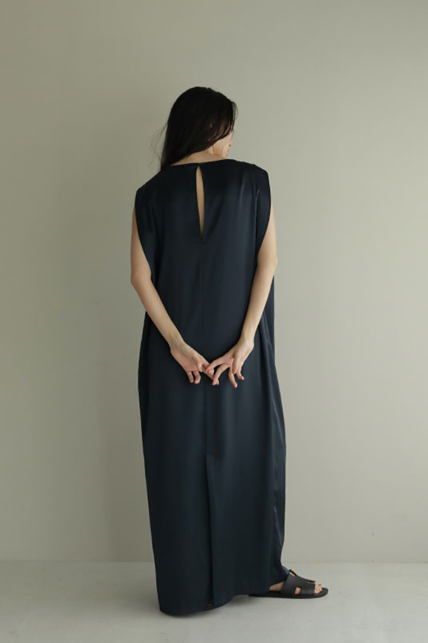 無駄を削ぎ落としたソリッドなデザインが特徴のサテンワンピース。