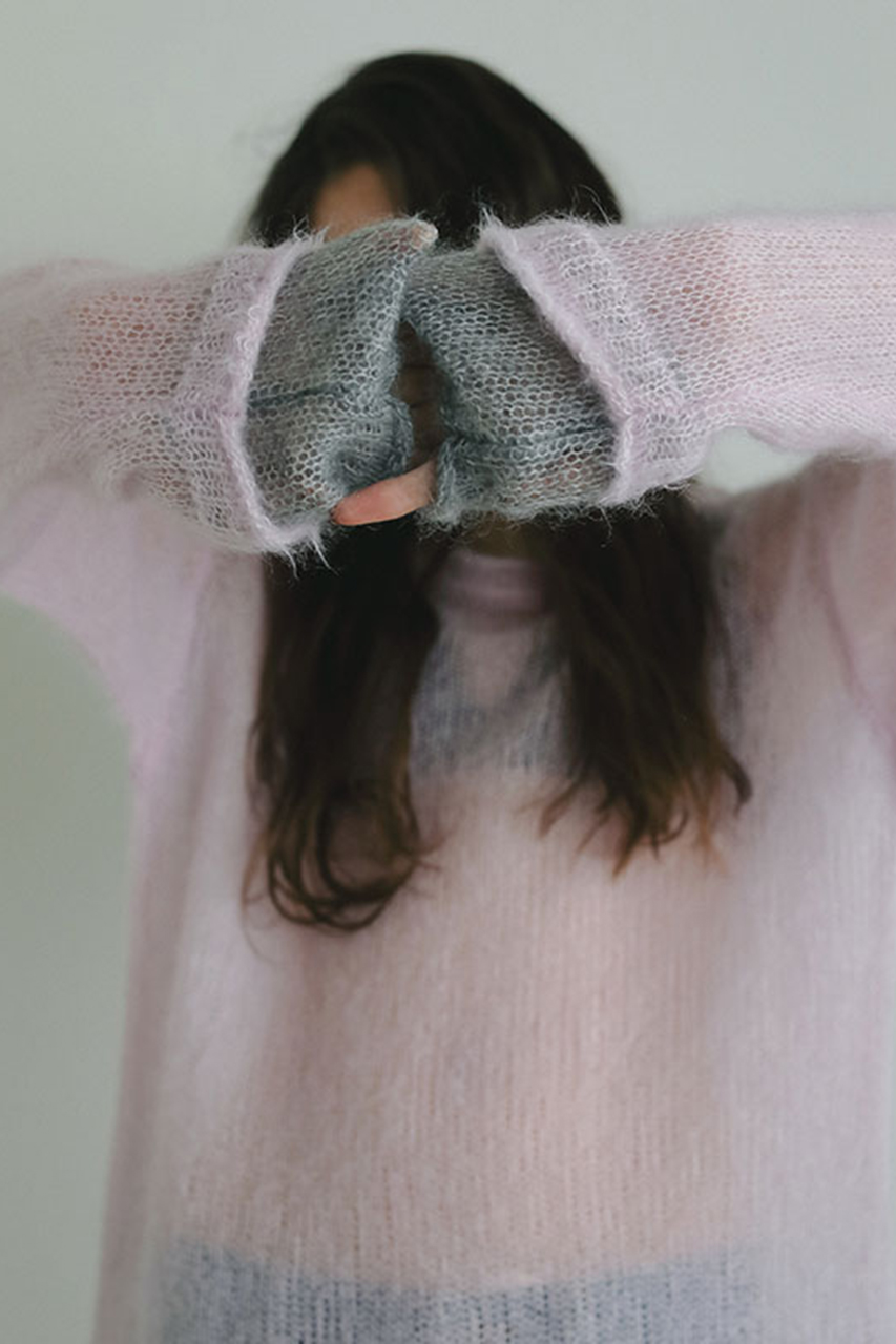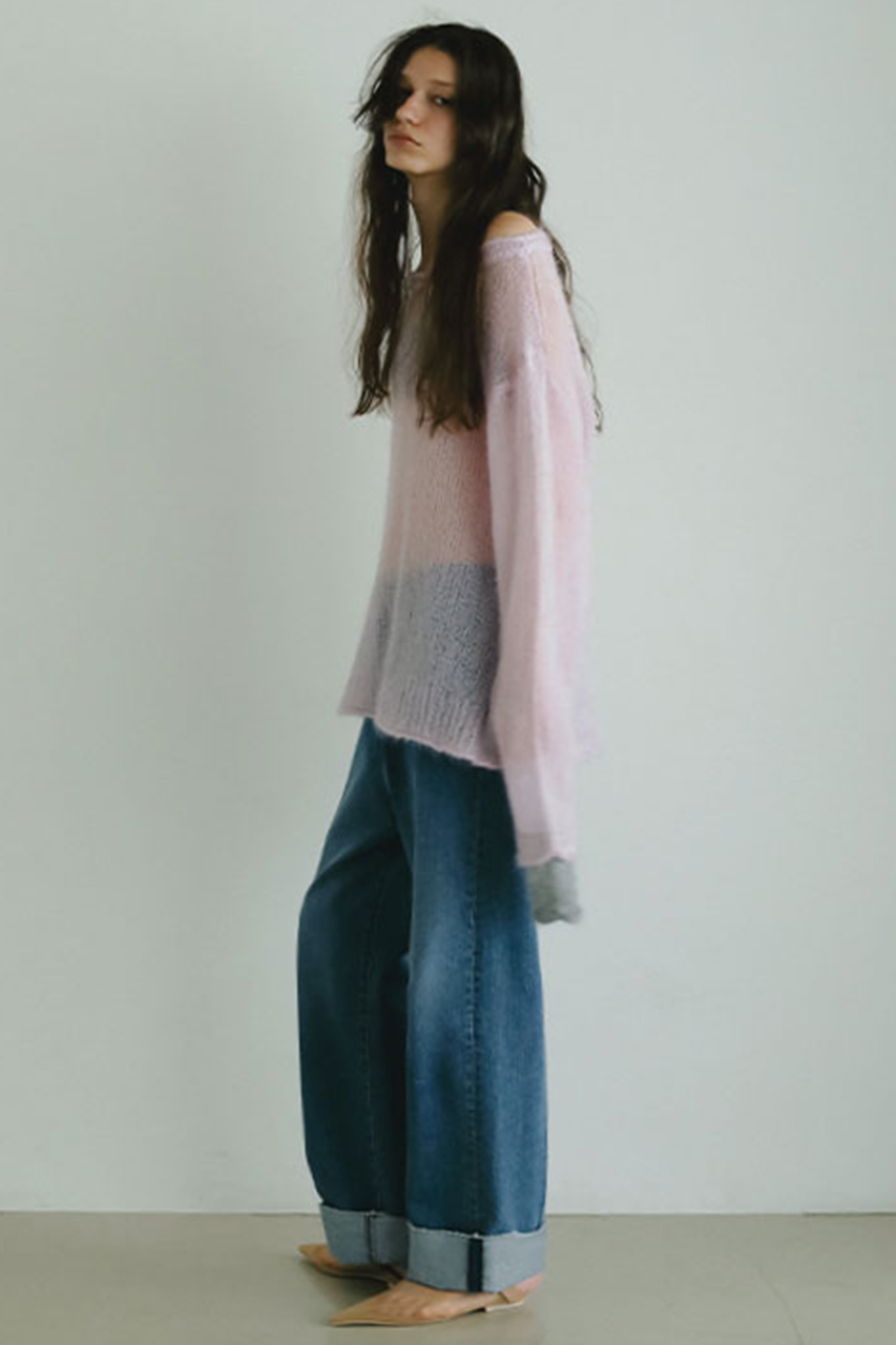スーパーキッドモヘヤ、カシミヤ、シルクを贅沢にブレンドした希少な糸を使用。ふんわりとした起毛感とカシミヤの柔らかさに加え、シルク由来の自然な光沢が奥行きのある表情を引き出します。横に広めに開けたネックラインとほどよくゆとりのあるシルエットが、抜け感のある女性らしさを演出。長めに設定されたスリーブは袖口で自然に留まり、クシュっとしたたるみがニュアンスをプラスします。袖先の配色デザインがさりげないアクセントとなり、シンプルなスタイリングにも奥行きプラス。透け感のある編地を活かして、インナーとのレイヤードスタイルを楽しむのがおすすめです。