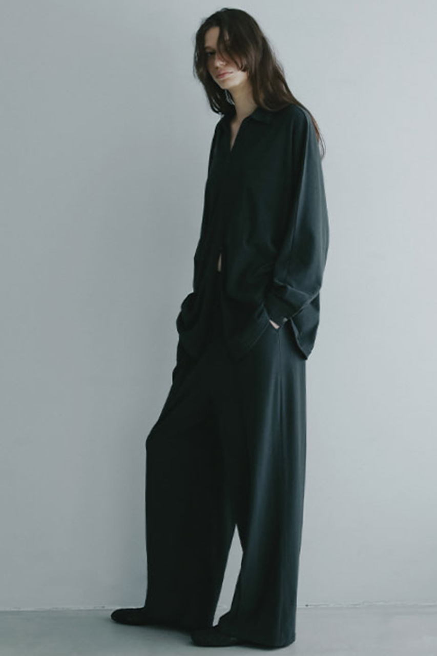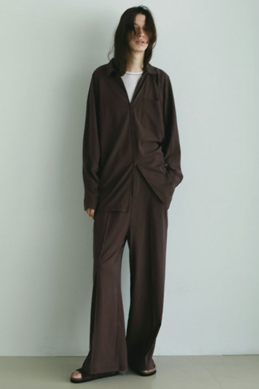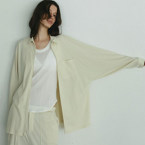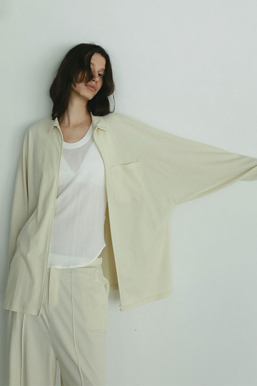 シャリ感とドライな風合いが魅力の、カットソー素材で仕立てたジップファスナーシャツとリラクシーパンツ。