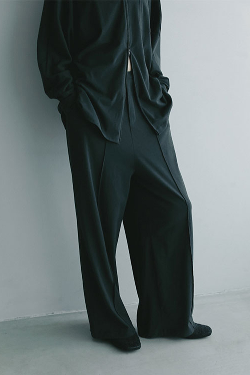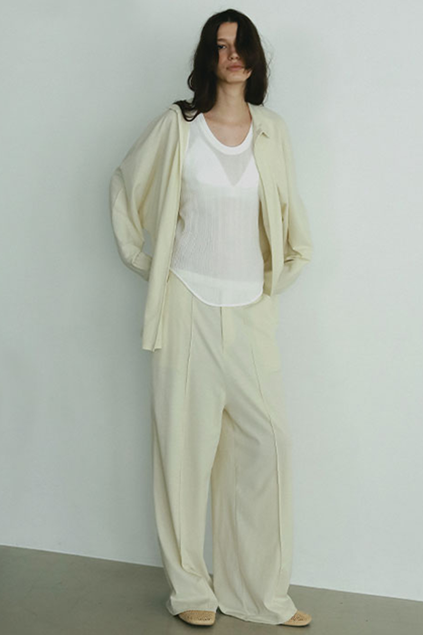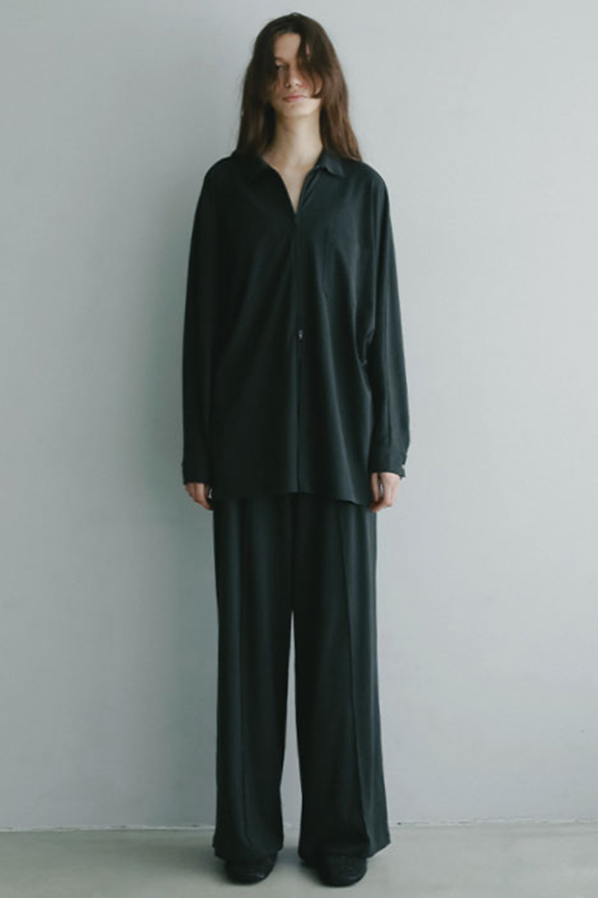 シャリ感とドライな風合いが魅力の、カットソー素材で仕立てたジップファスナーシャツとリラクシーパンツ。