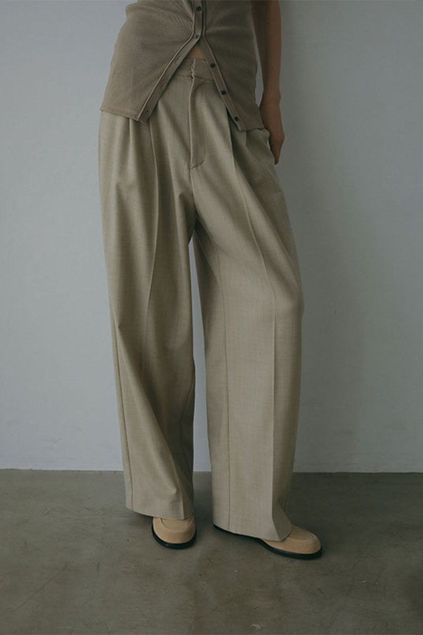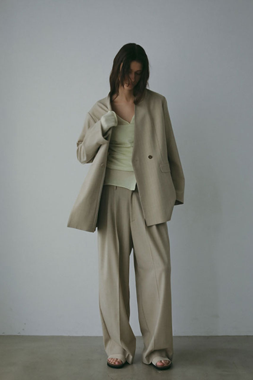 お揃いのタック入りのワイドパンツとセットアップで着こなすのもおすすめ。