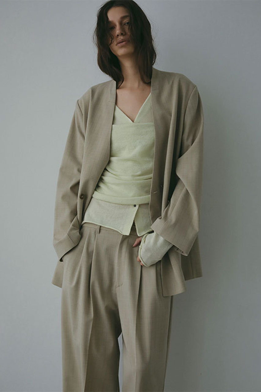 上品な表面感としなやかさを兼ね備えた素材を使用、きちんと感を保ちつつ、ストレスフリーな軽やかさが魅力です。メンズライクなディテールを取り入れつつ、落ち感のある素材と肩の力を抜いたシルエットが絶妙なバランスを生み出す一枚。