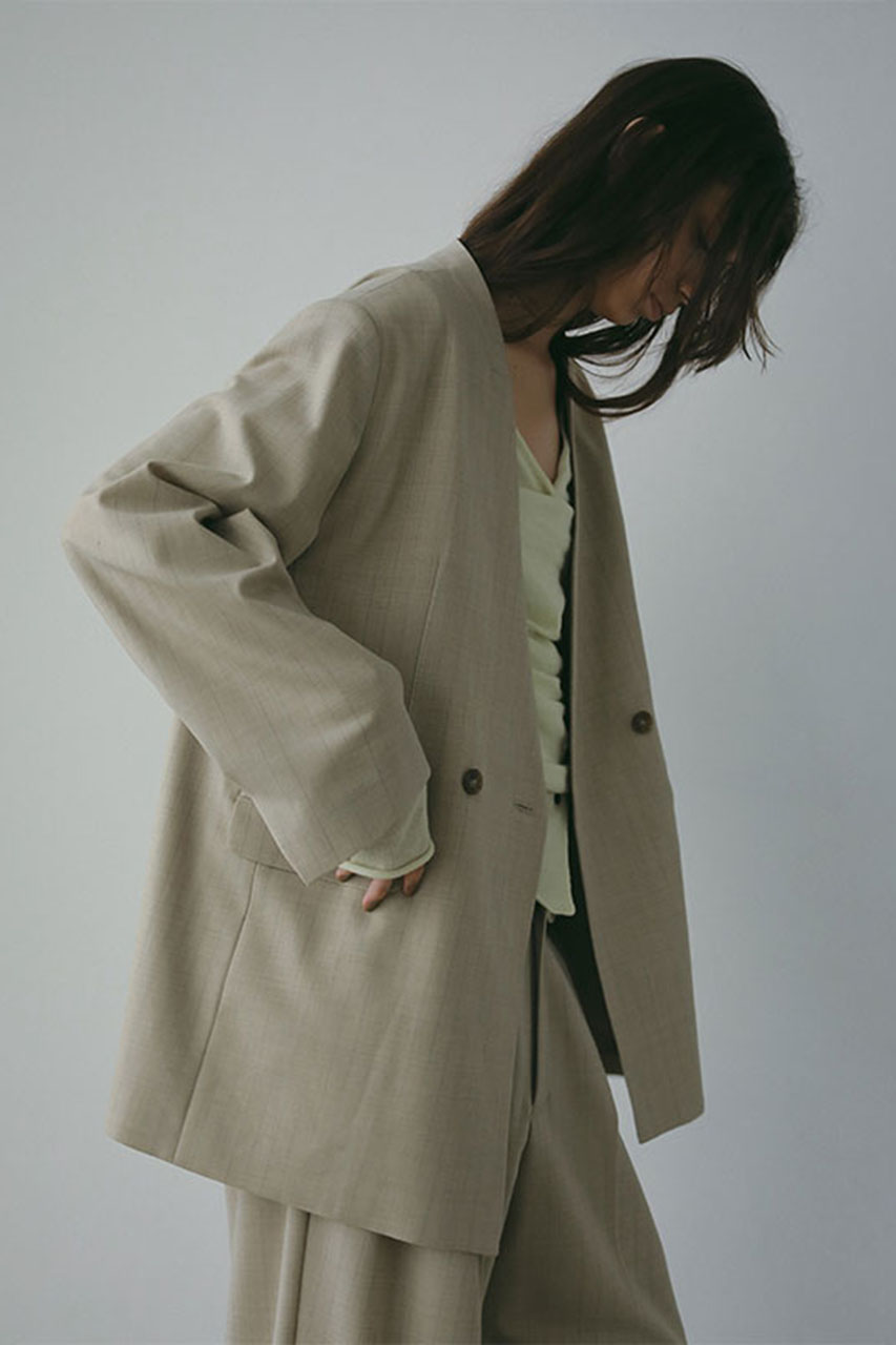 端正な印象をまとえる、ダブルブレスト仕様のノーカラージャケット。