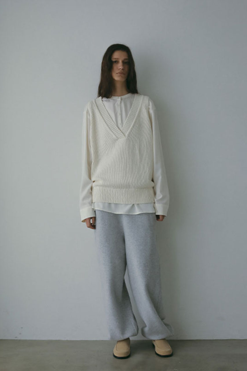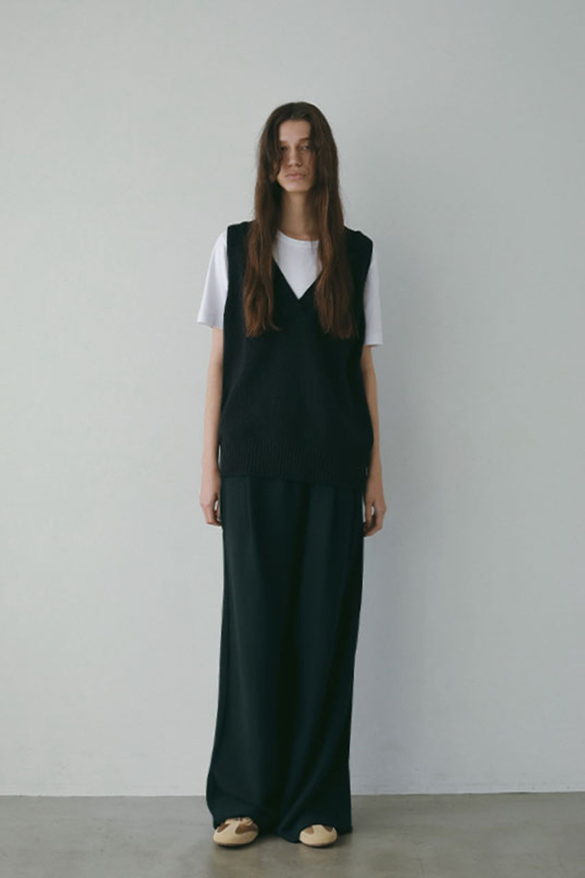 一枚ではもちろん、シャツやカットソーとのレイヤードも楽しめる絶妙な丈感も魅力。ボトムスとのバランスが取りやすく、タックインせずに着るだけでもサマになる一枚です。シーズンレスで活躍するベストは、ワードローブに一枚は持っておきたい万能アイテムです。