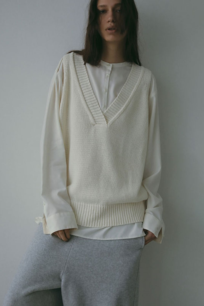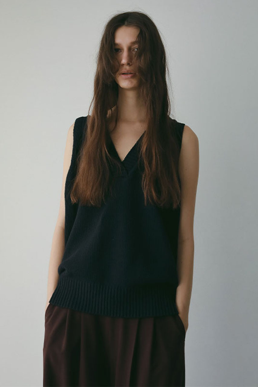 深めのVネックと肩にかかるノースリーブデザインが、抜け感のある印象を与えてくれるニットプルオーバー。
