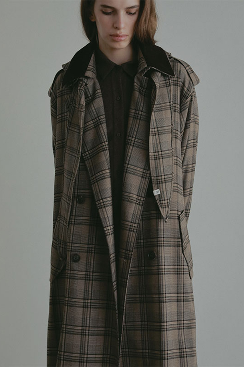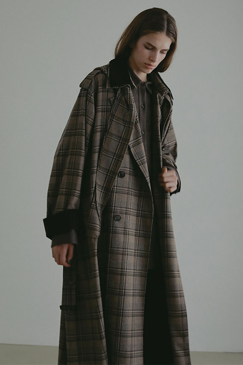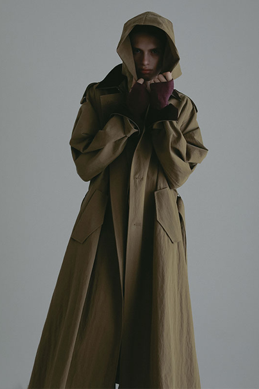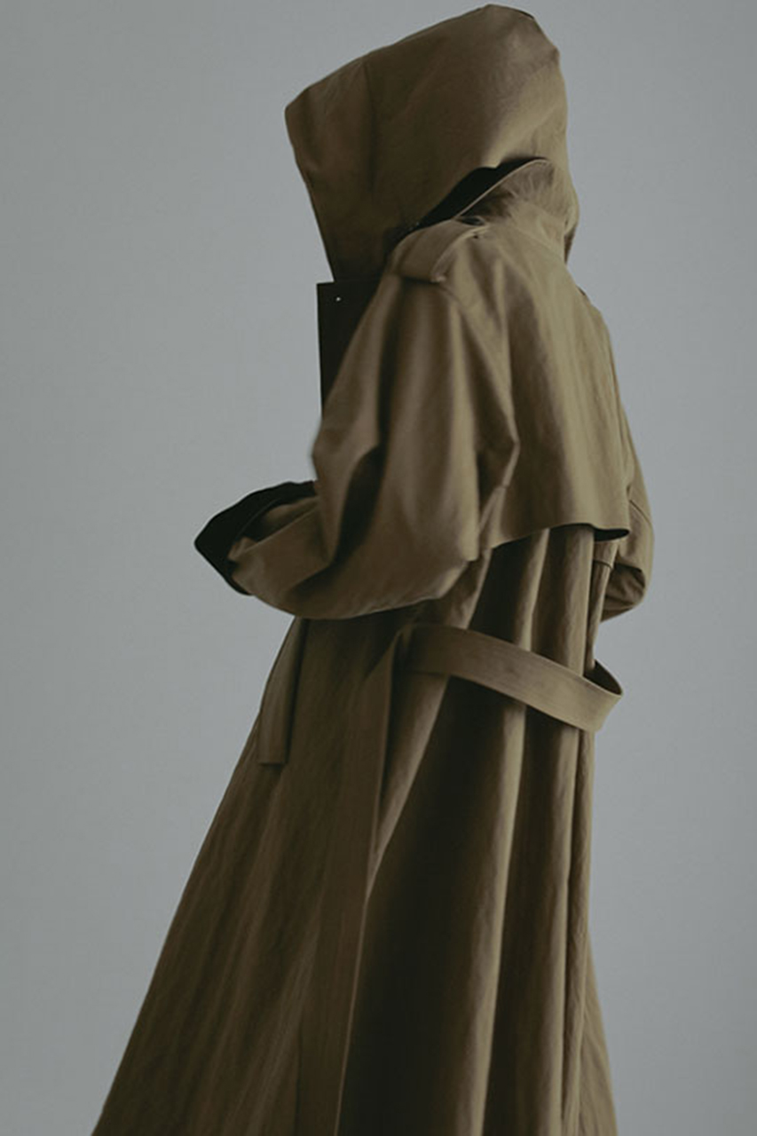 シンプルながらもこだわりのディテールが光るロングトレンチコート。