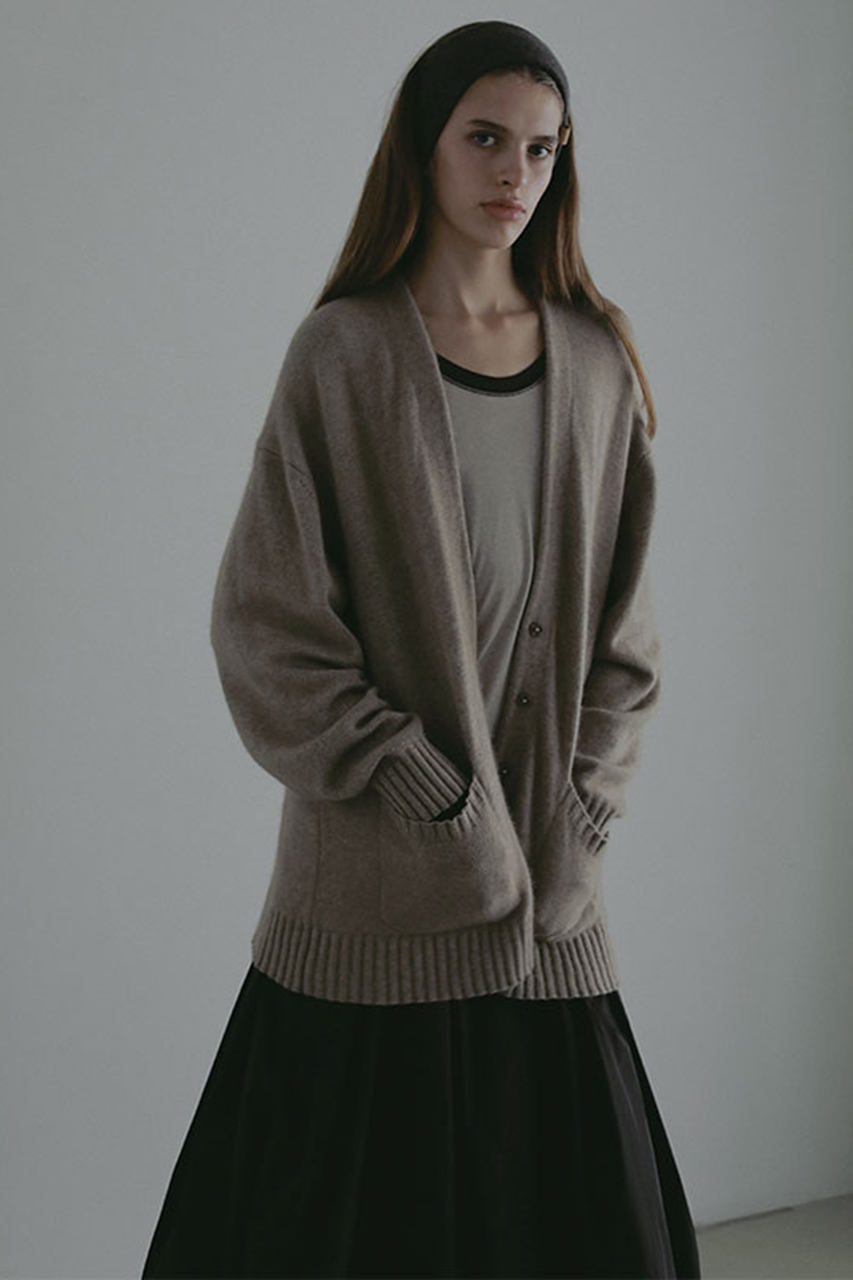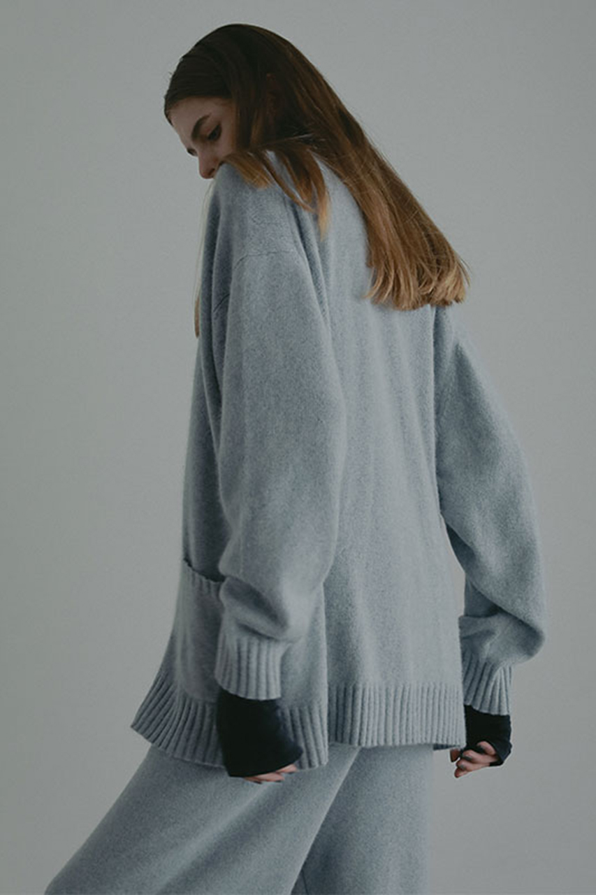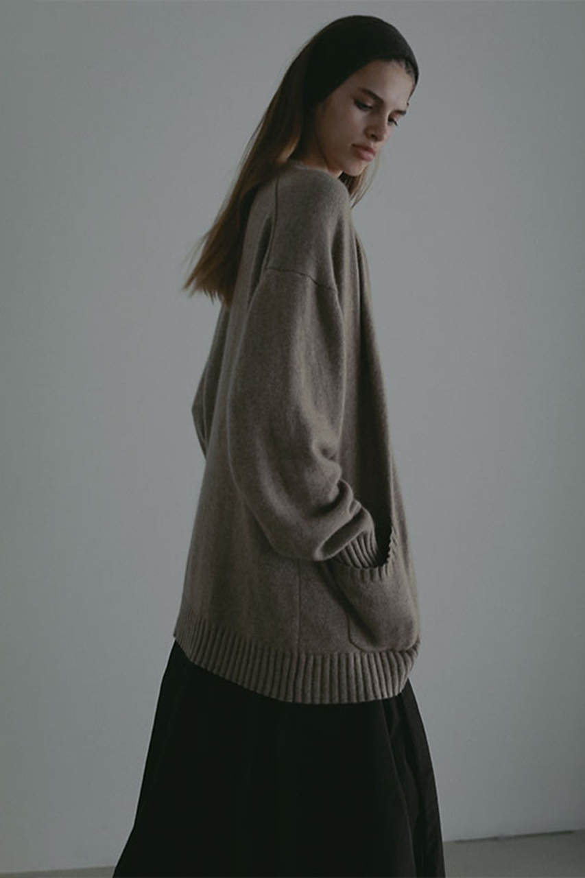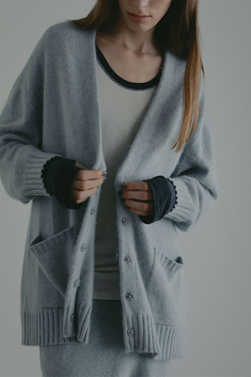 ナイロンをベースに、アンゴラとウールをブレンドした素材は、肌に寄り添うようななめらかなタッチが特徴。ミドルゲージながら厚すぎず軽やかな着心地で、季節の変わり目にも心地よく羽織っていただけます。ゆったりとしたオーバーサイズのシルエットに、すっきりと深めのVネックライン。フロントには主張しすぎないスナップボタンを配し、全体の柔らかな印象を損なわない仕上がりに。裾と袖口のリブがさりげなく引き締め役となり、シルエットに自然なメリハリを添えます。