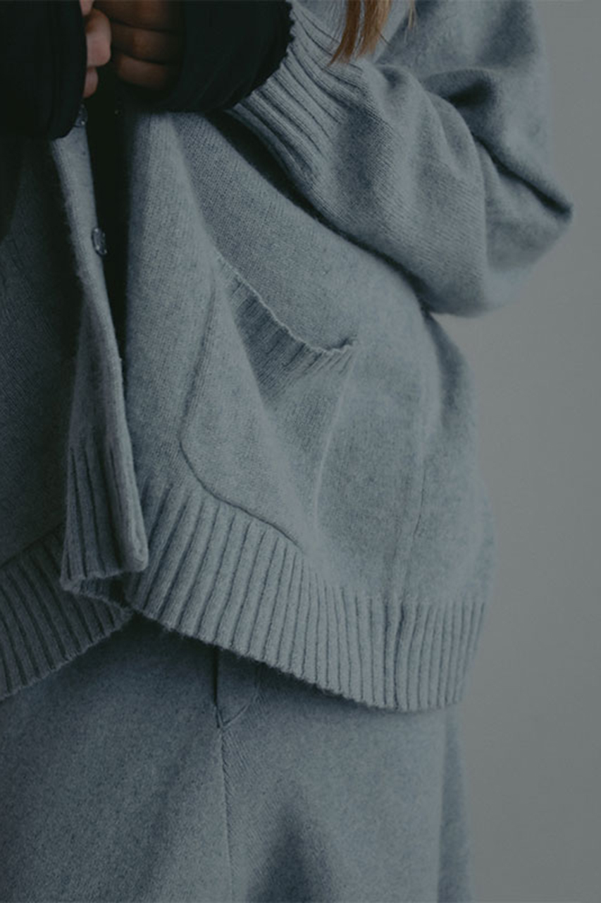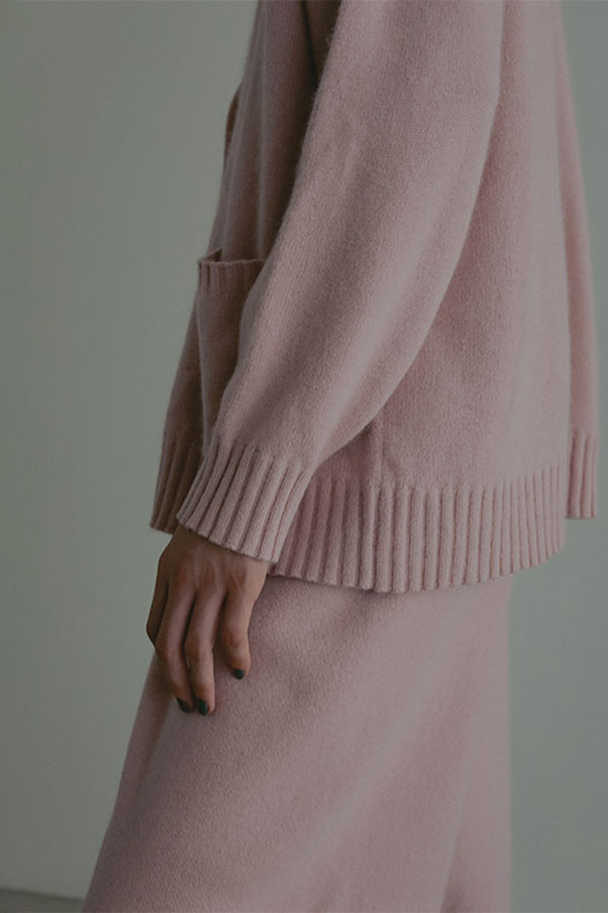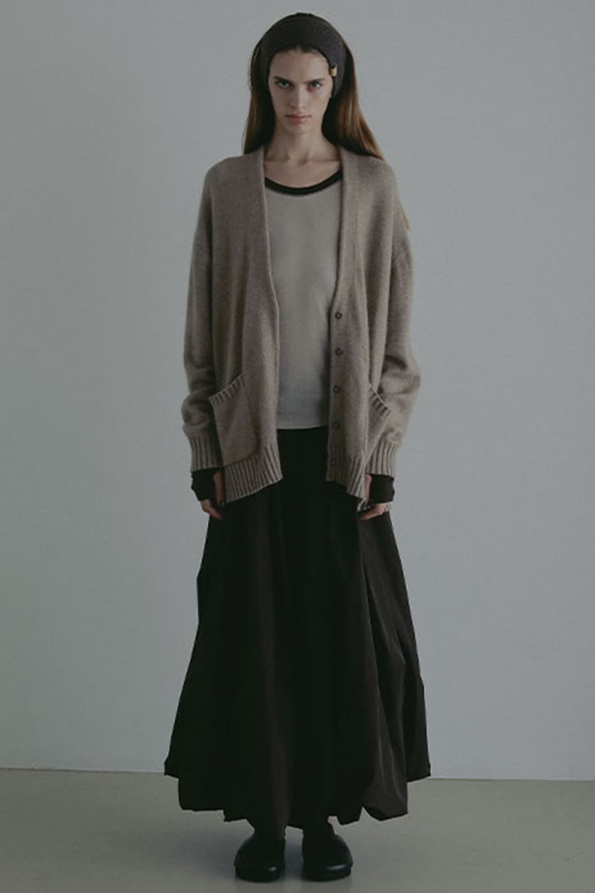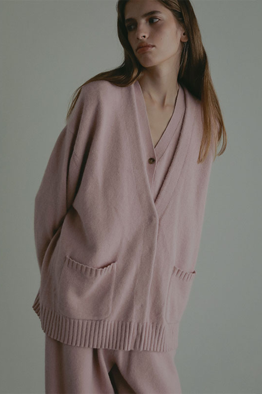 ナイロンをベースに、アンゴラとウールをブレンドした素材は、肌に寄り添うようななめらかなタッチが特徴。ミドルゲージながら厚すぎず軽やかな着心地で、季節の変わり目にも心地よく羽織っていただけます。ゆったりとしたオーバーサイズのシルエットに、すっきりと深めのVネックライン。フロントには主張しすぎないスナップボタンを配し、全体の柔らかな印象を損なわない仕上がりに。裾と袖口のリブがさりげなく引き締め役となり、シルエットに自然なメリハリを添えます。