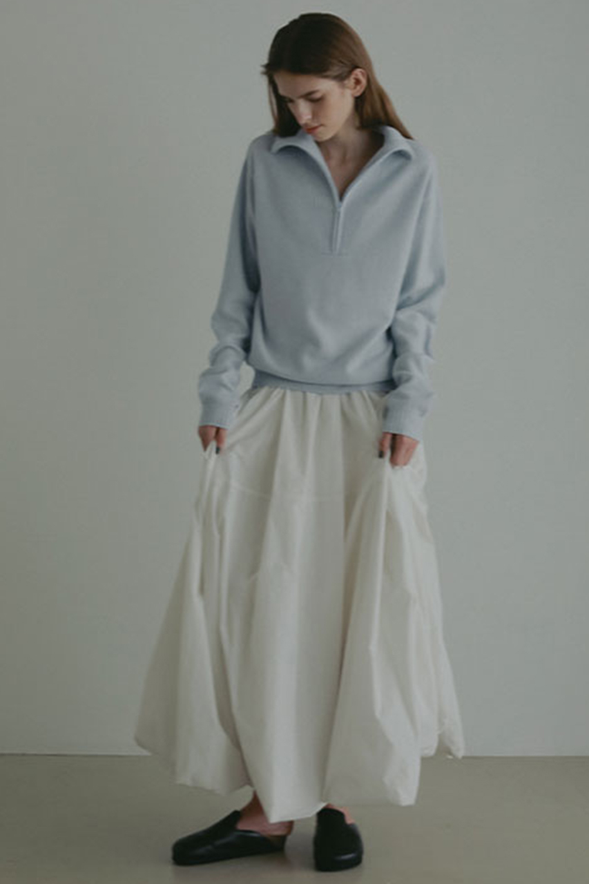 表地には形状記憶のあるポリエステル素材を使用、着用中もふくらみをしっかりキープ。軽やかで皺になりにくく、ロング丈ながらもストレスフリーな着心地を叶えます。たっぷりと生地を使って丁寧に仕立てることで、ふんわりと広がる美しいシルエットが実現。スカート裾の内側にはスピンドルが隠されており、お好みでバルーンの丸みを調整することができるのもポイントです。