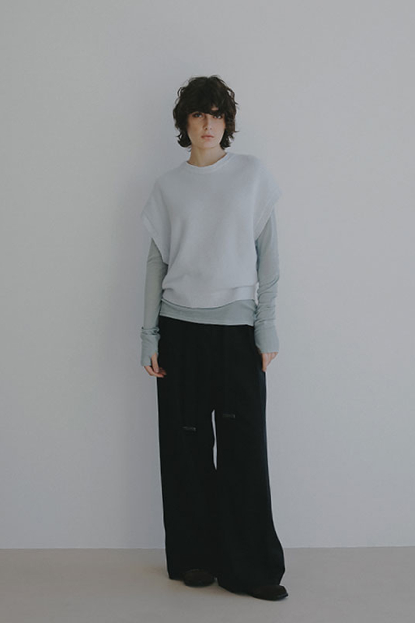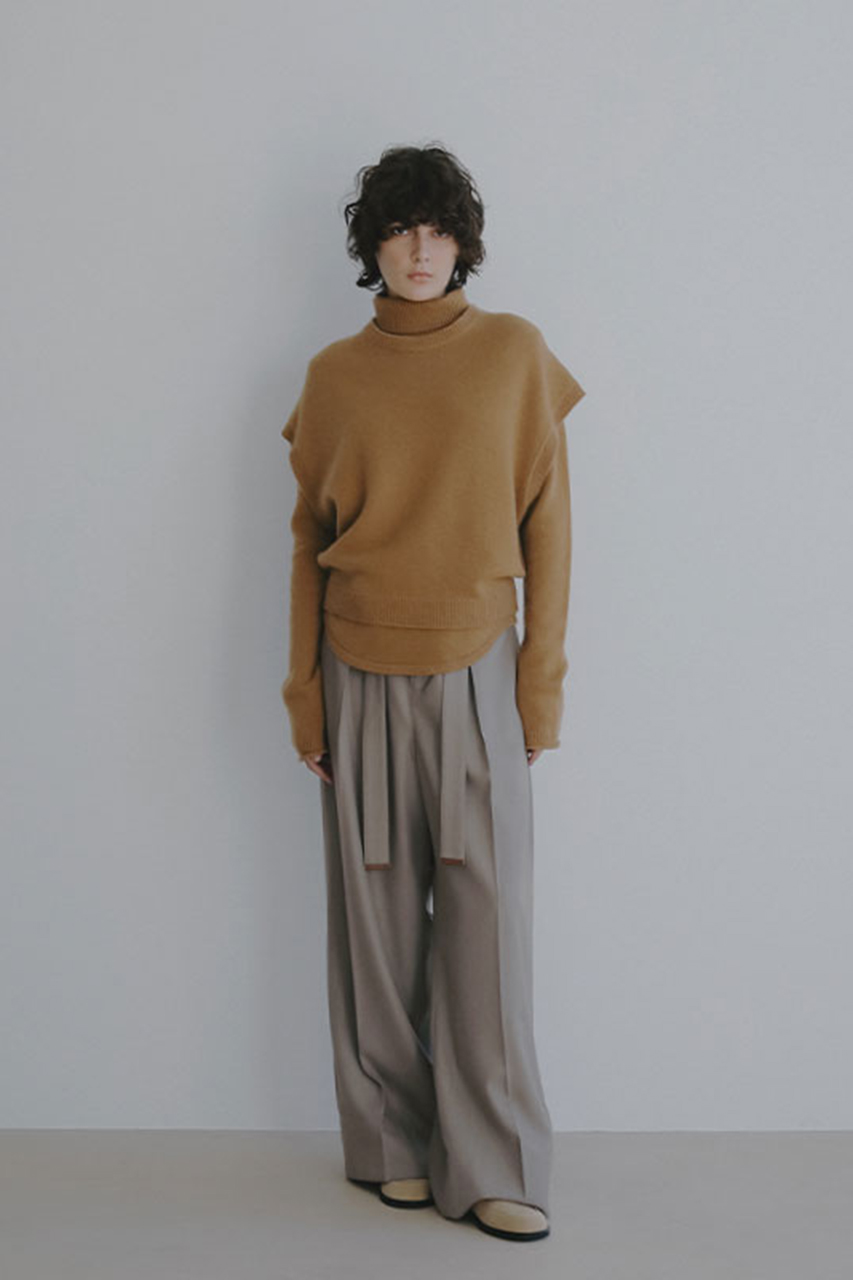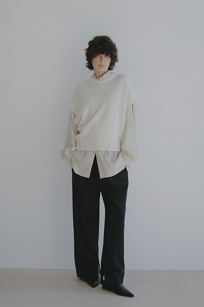 シャツやシアートップスをインすれば、軽やかさと立体感が加わり、着こなしの幅が広がります。ジャケットのインナーとしても相性が良く、落ち着きのある佇まいと柔らかな素材感が調和した、 洗練されたスタイリングを楽しめるアイテムです。