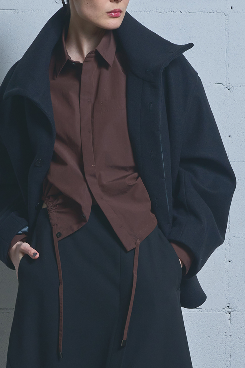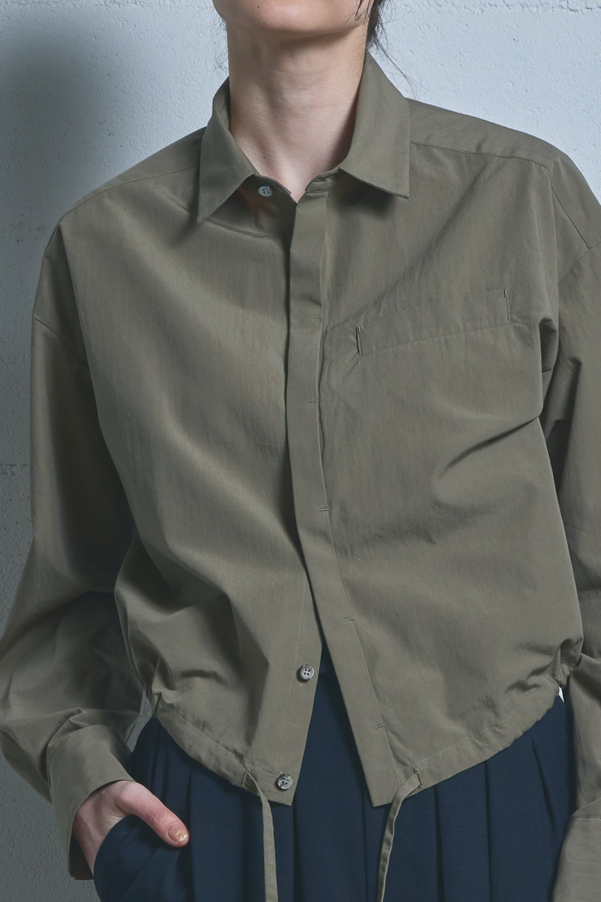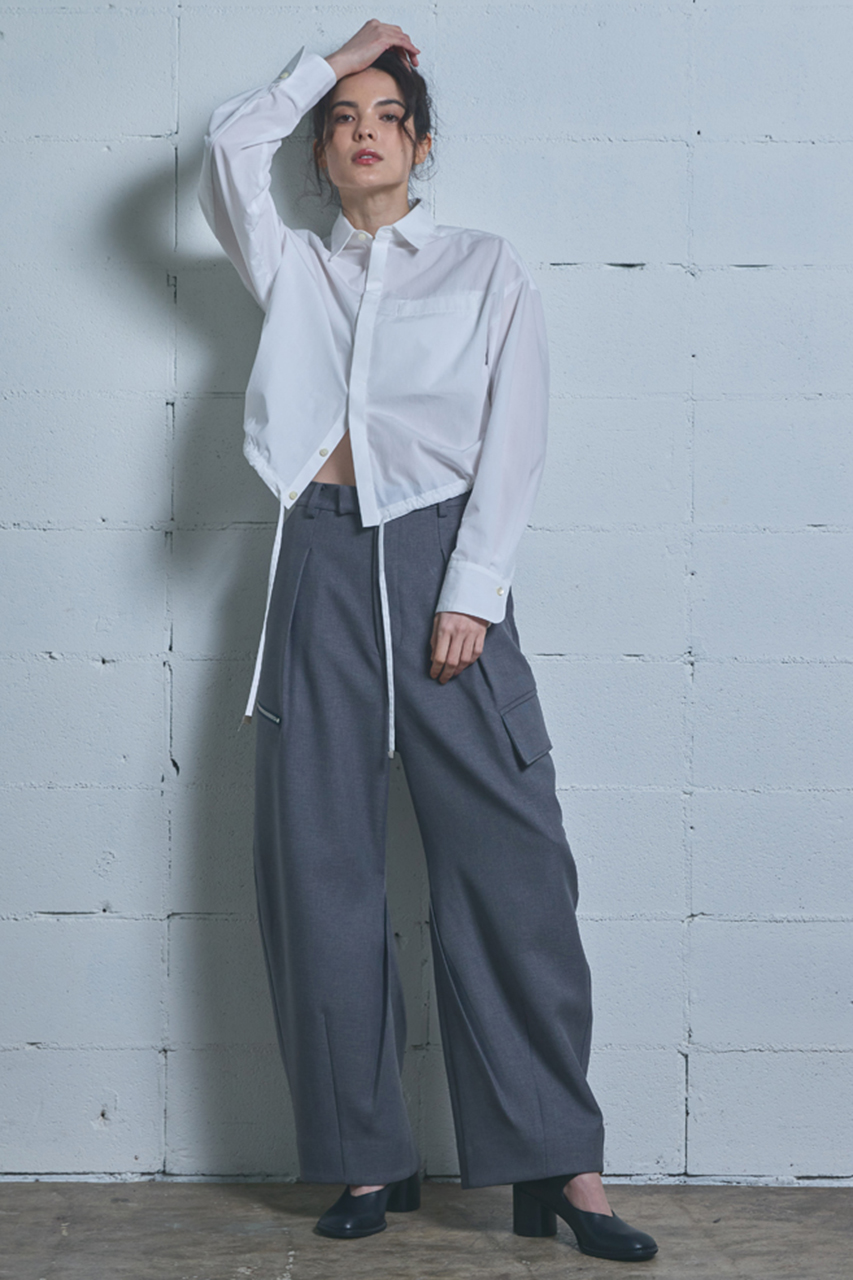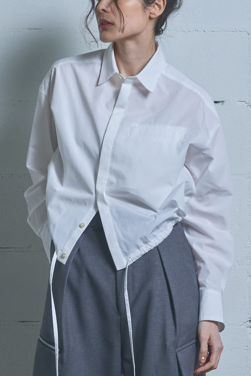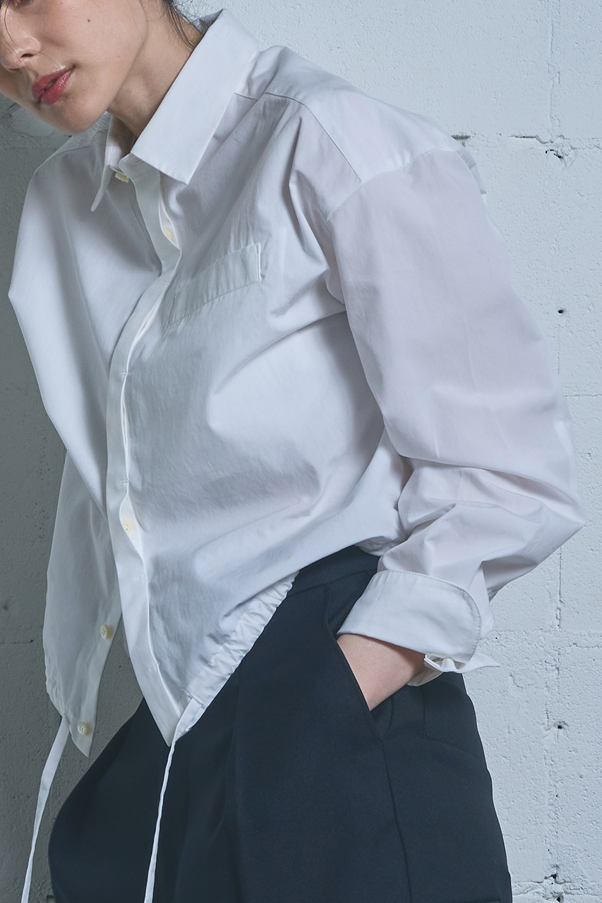 ベーシックな白シャツに、ウエスト部分のドローストリングディテールでひとひねり加えたデザインが特徴。一見シンプルでありながらスタイル全体にメリハリを与え、シルエットを美しく引き立てます。オーソドックスな白シャツこそ、技ありディテールで洗練された着こなしにトライしてみて。