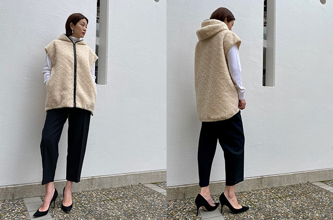 軽くて柔らかいウール100%のボアを使ったフード付きベスト。フェイクレザーのパイピングがカジュアルになりすぎず、全体の印象を引き締めます。裾にゴムが仕込まれているので自然と丸みのあるシルエットに。インナーはニットでもカットソーでも、気分に合わせて様々な着まわしが叶うアイテムです。