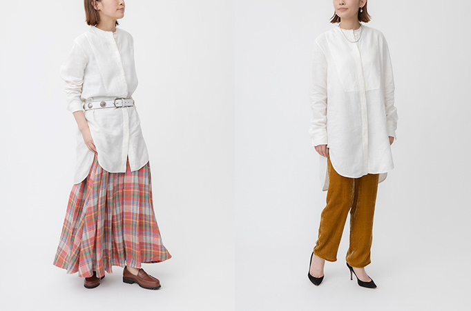 表面を起毛させたリネンは、温かみがありながらも軽やかな仕上がりが◎。コンパクトな細身のシルエットとヒップまで隠れる長めの丈で、合わせるボトムスを選びません。フレアスカートと合わせる時はお手持ちのベルトでウエストマークしてスタイルアップ効果を狙って。カジュアルにもエレガントにも、シーンによって表情の異なるスタイリングの叶うオールマイティな一着です。