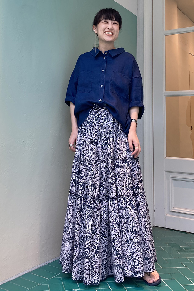 ひとつ上の画像と同じペイズリーのスカートに、「ハウス オブ ロータス」の定番と言えるインドの“カディコットン”を使用したスキッパーシャツを合わせれば、フェミニンになりすぎないラフな着こなしが完成! 淡いブルーがさらに爽やかさをプラス。(スタッフ身長170cm 着用サイズM)