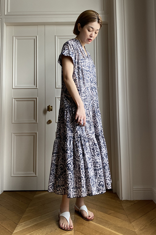 スカートと同じ素材を使用したティアードワンピース。首元はすっきりとしたスキッパー、裾にかけてさりげなくティアードシルエットになっているので甘くなりすぎず大人の女性にぴったり。袖が二の腕をカバーしてくれる絶妙な丈で、細部までこだわりが詰まっています。まだまだ続く汗ばむ季節には一枚でさらりと決まるワンピースが強い味方に! (スタッフ身長170cm 着用サイズM)