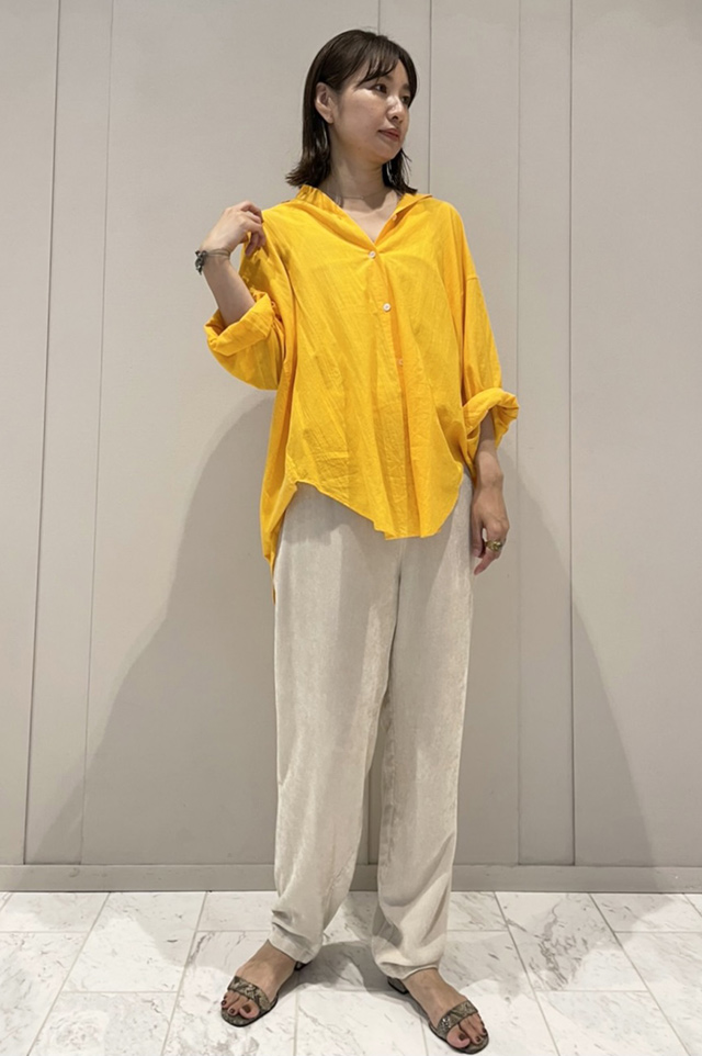 日差しに映える鮮やかなイエローが目を惹くシャツが主役のコーディネート。“カディコットン”は通気性、速乾性に優れていてシーズンレスに大活躍! 長袖シャツは日焼けが気になる時にサッと羽織ったり、巻いたり、様々な使い方ができる万能アイテムです。ボトムスにコーデュロイパンツを合わせて異素材ミックスを楽しんで。(スタッフ身長165cm 着用サイズM)