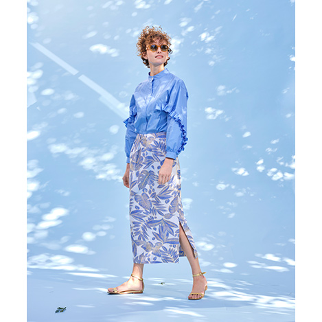 シンプルなバンドカラーと、スリーブとボディを横断するミニフリルの甘辛バランスが絶妙な大人ブラウス。ナローシルエットのスカートにインしたり、カジュアルなパンツにオーバーで合わせたり、一枚で春夏のスタイリングに彩りを添えてくれるはず。通常のコットンと比べて繊維が長い140番双糸のピマコットンは、肌触りが滑らかで吸水性も高く、汗ばむ春夏を快適に過ごすことができるのも嬉しい!