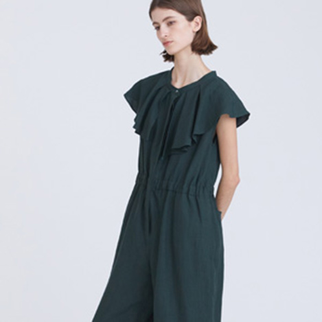 ハリを残しつつナチュラルで柔らかな風合いが魅力のリネンコンビネゾン。カジュアルになりがちなリネン素材を襟ぐりのケープと深みのあるグリーンでドレッシーに仕上げました。ウエスト内側がドロスト仕様になっているのでシルエットの変化も楽しめます。一枚で華やかに決まるコンビネゾンは初秋までロングシーズン活躍します。
