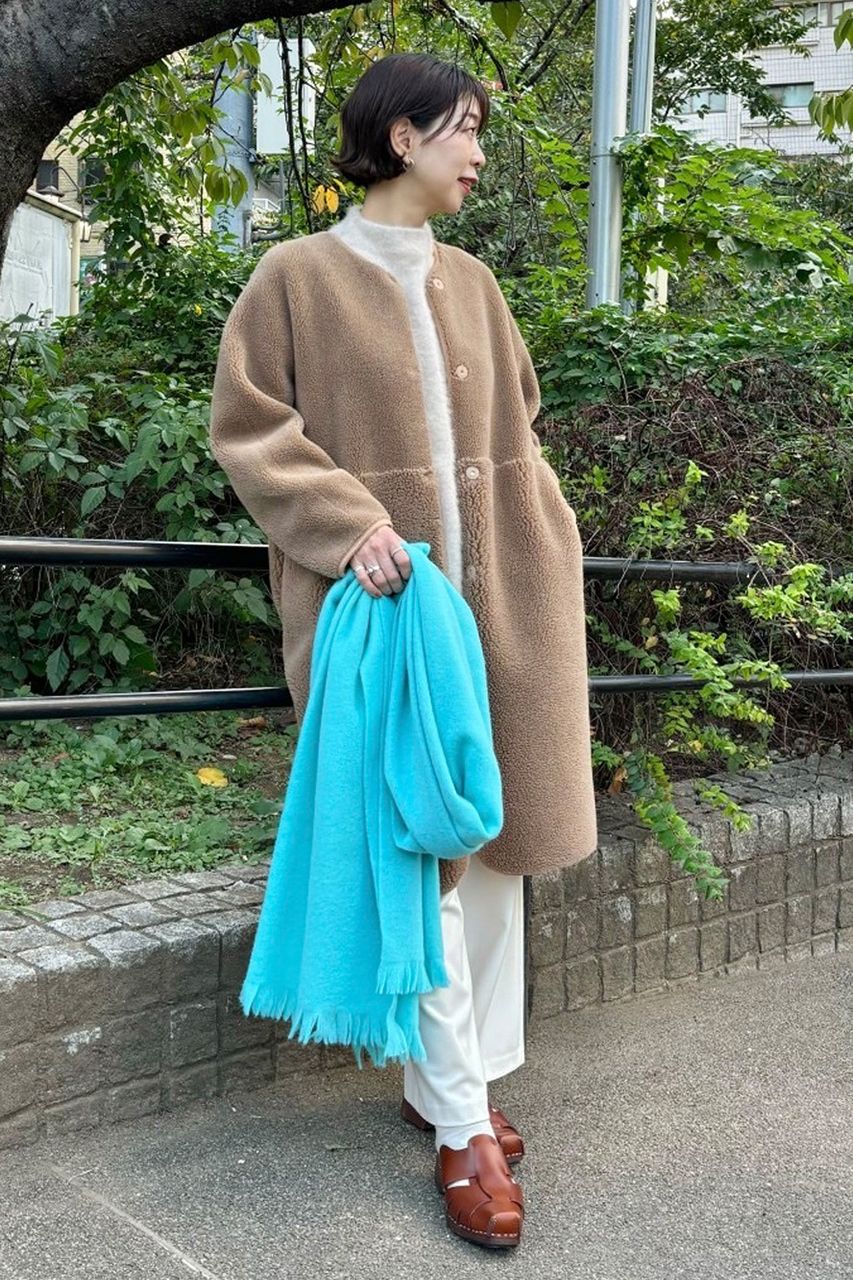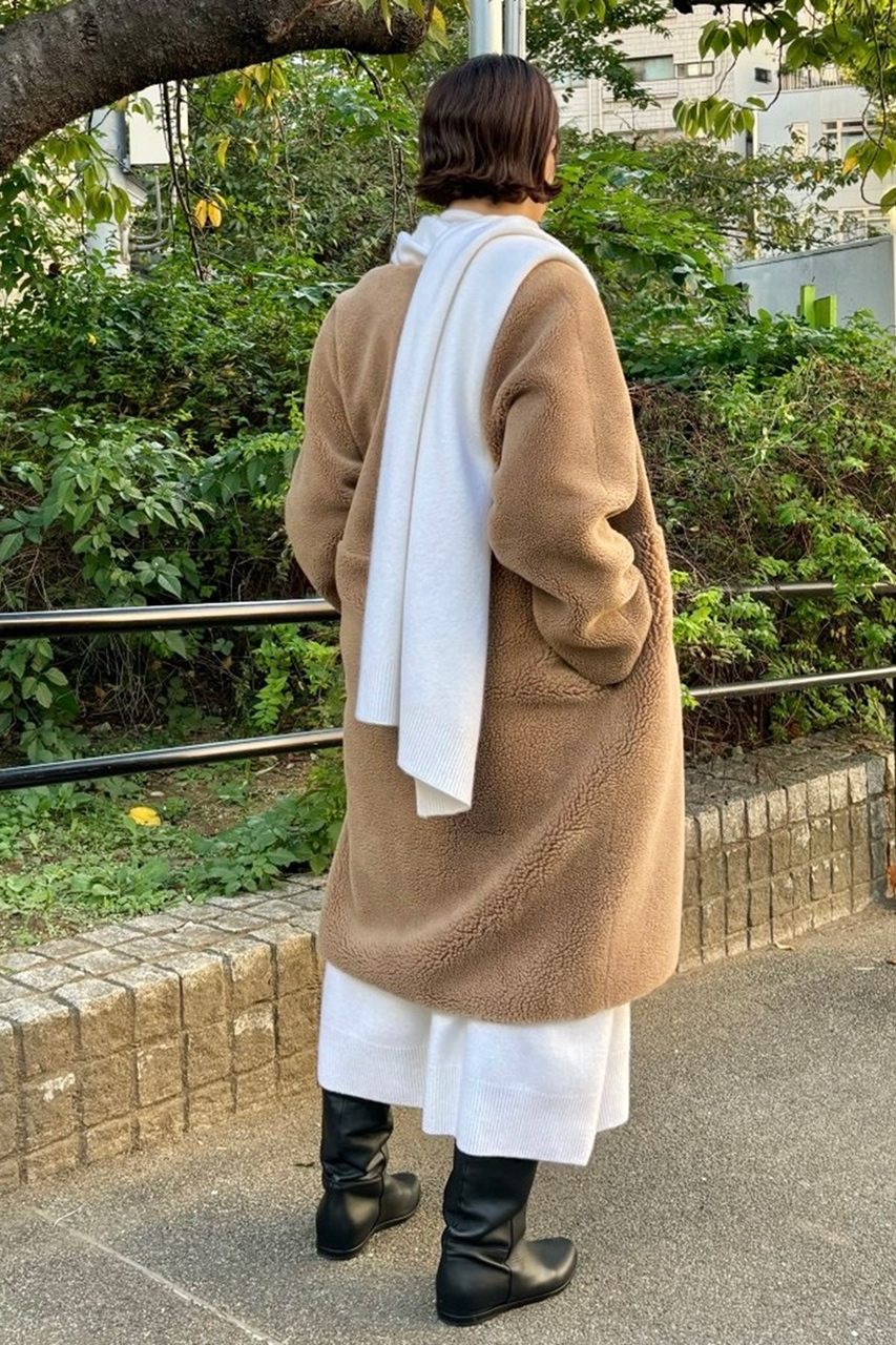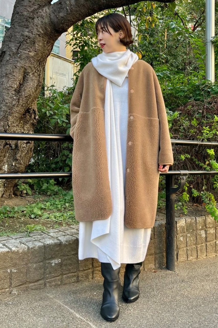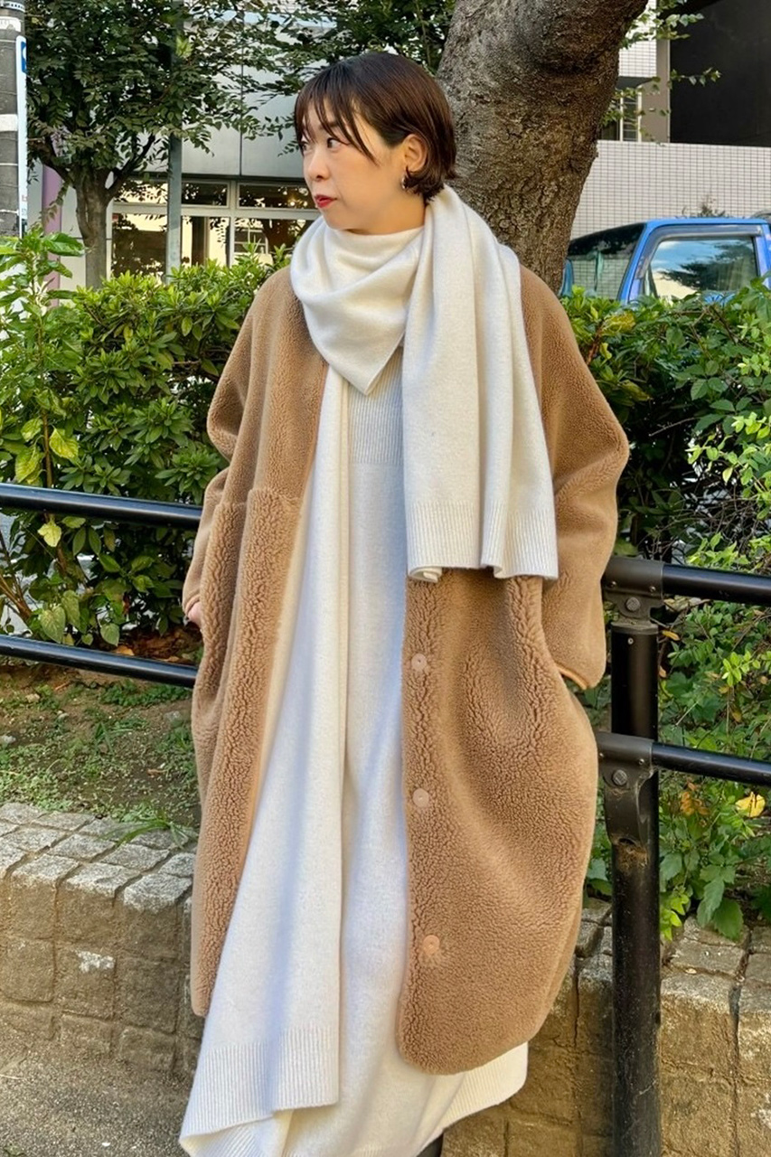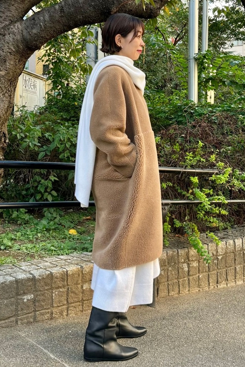 緩やかなナローシルエットがカジュアルすぎない大人のボアコートは、テディ風の“フワもこ”感が防寒性と着映えを兼ね備えた一着。驚くほど軽く、ストレスフリーな着心地です。毛足の長短がハイウエストで切り替えられていてスタイルアップ効果も狙えます! ウールニットワンピ&ストールジレのオールホワイトスタイリングでリッチ感を出した着こなしがお気に入り。