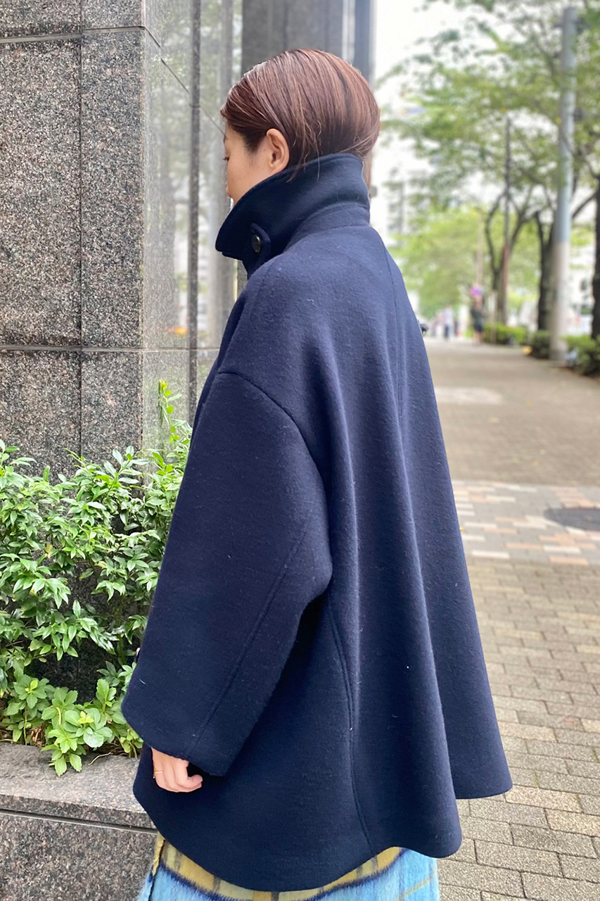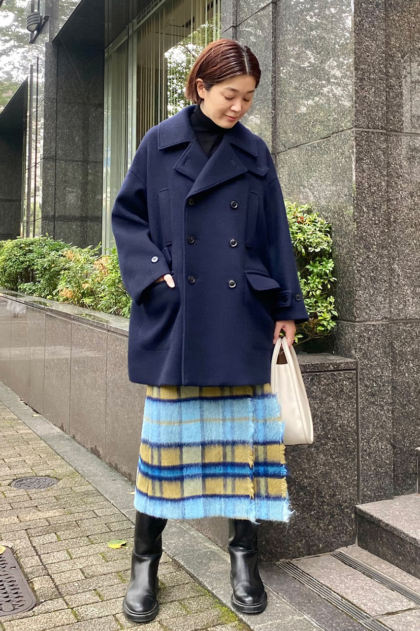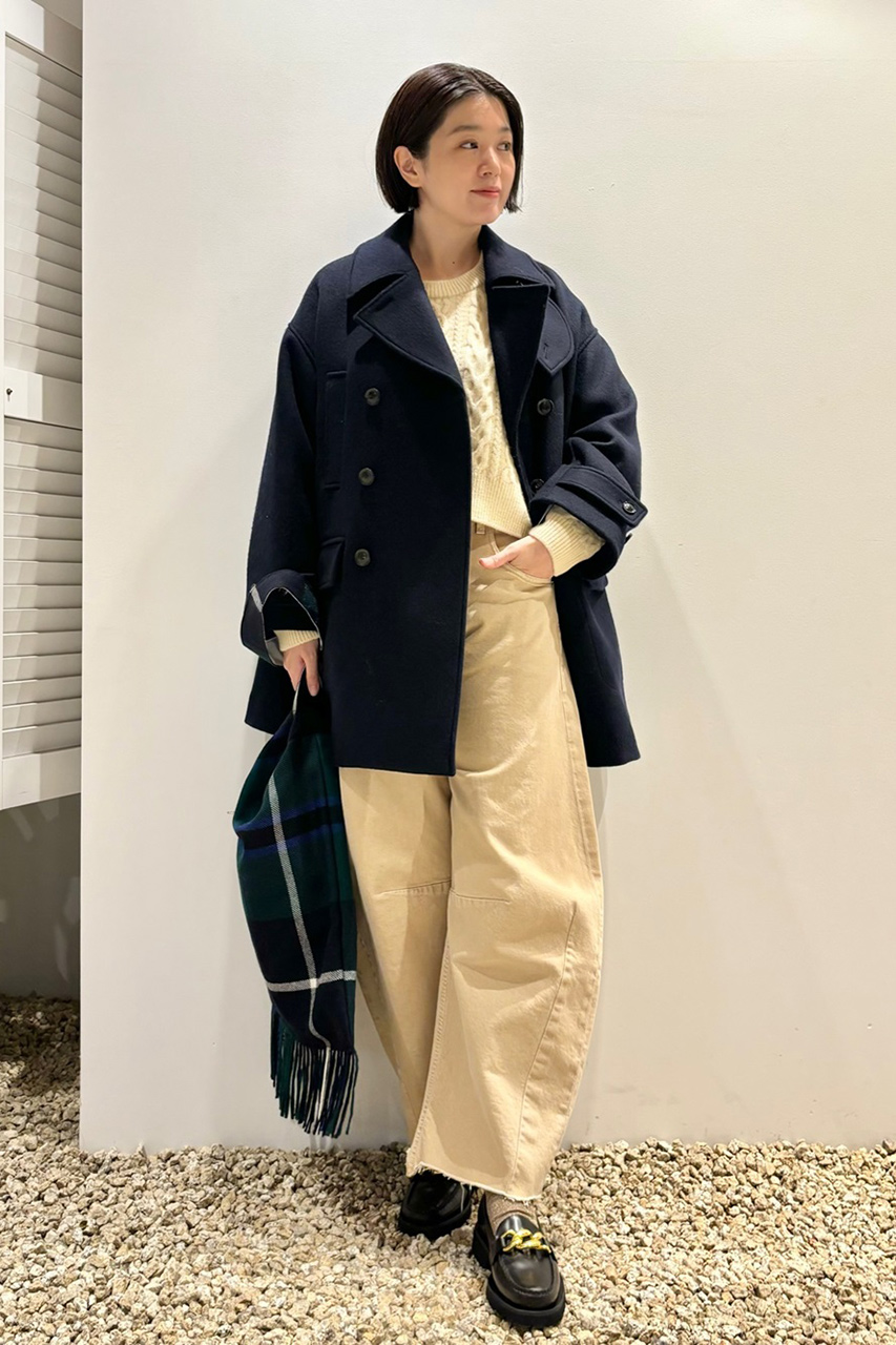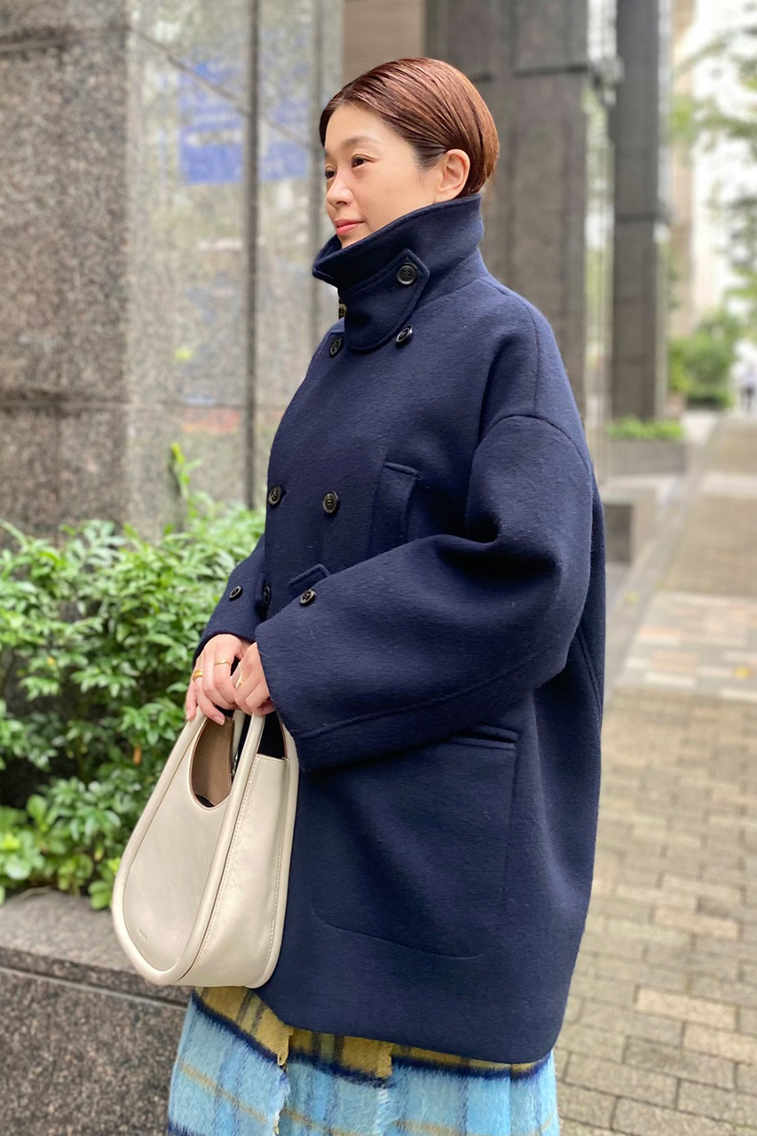 オーセンティックなPコートをオーバーサイズに仕立ててモダンにアップデート。ウールの中でも極細の糸を使用しているので滑らかで上質な風合いが魅力です。存在感のある大きめの襟はアクセントになるだけでなく、小顔効果も! 襟を立ててチンタブを留めたアレンジは、シンプルだからこそ引き立つ、サイドから見た時の構築的なシルエットがお気に入り。