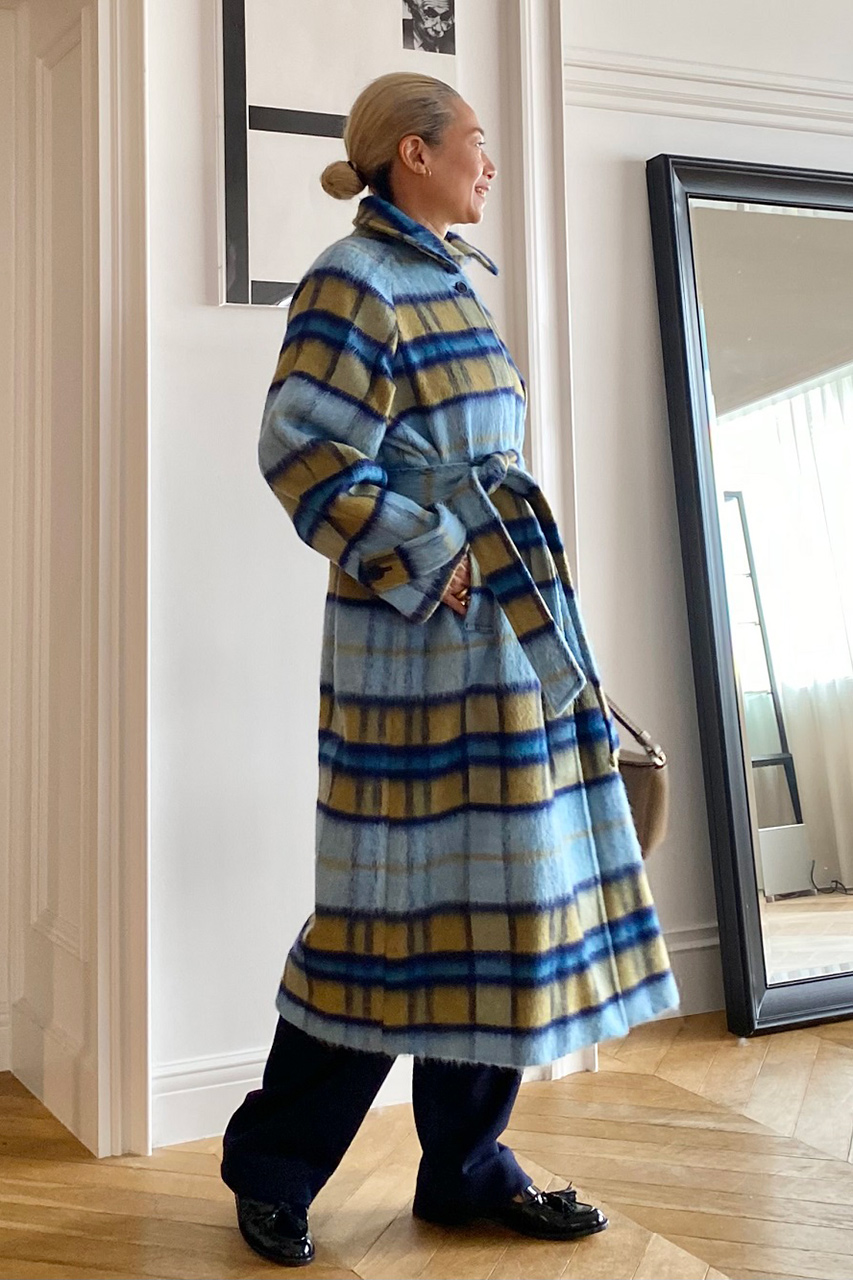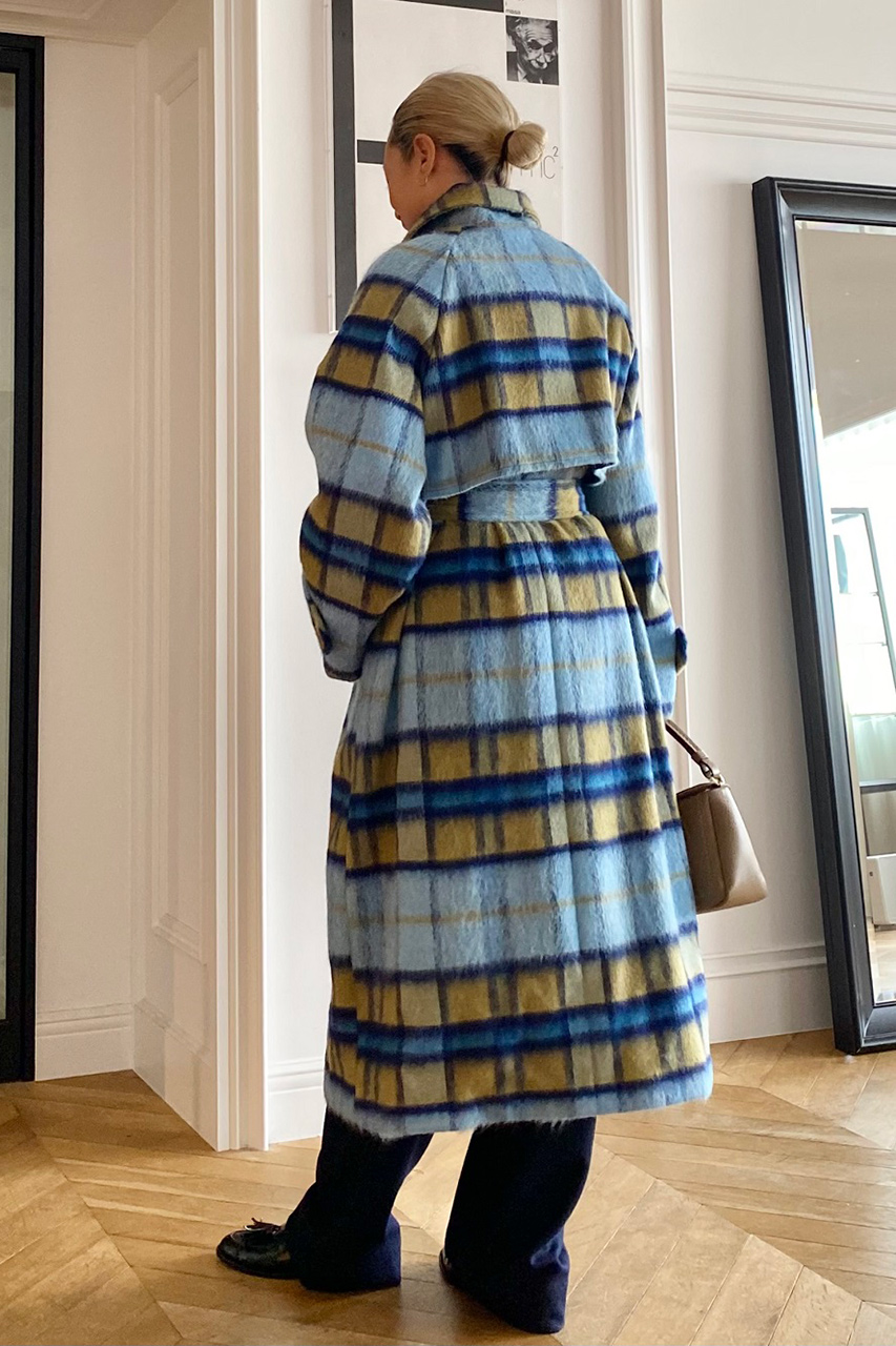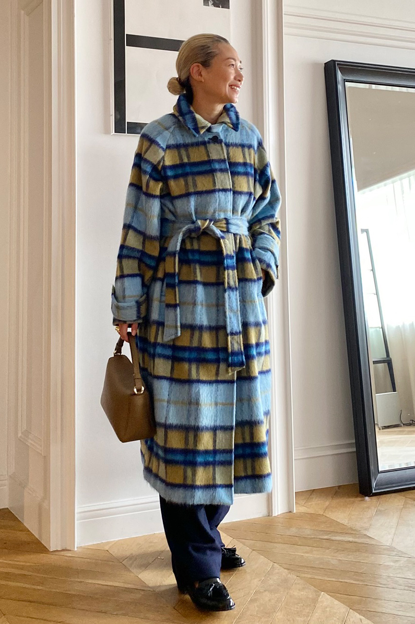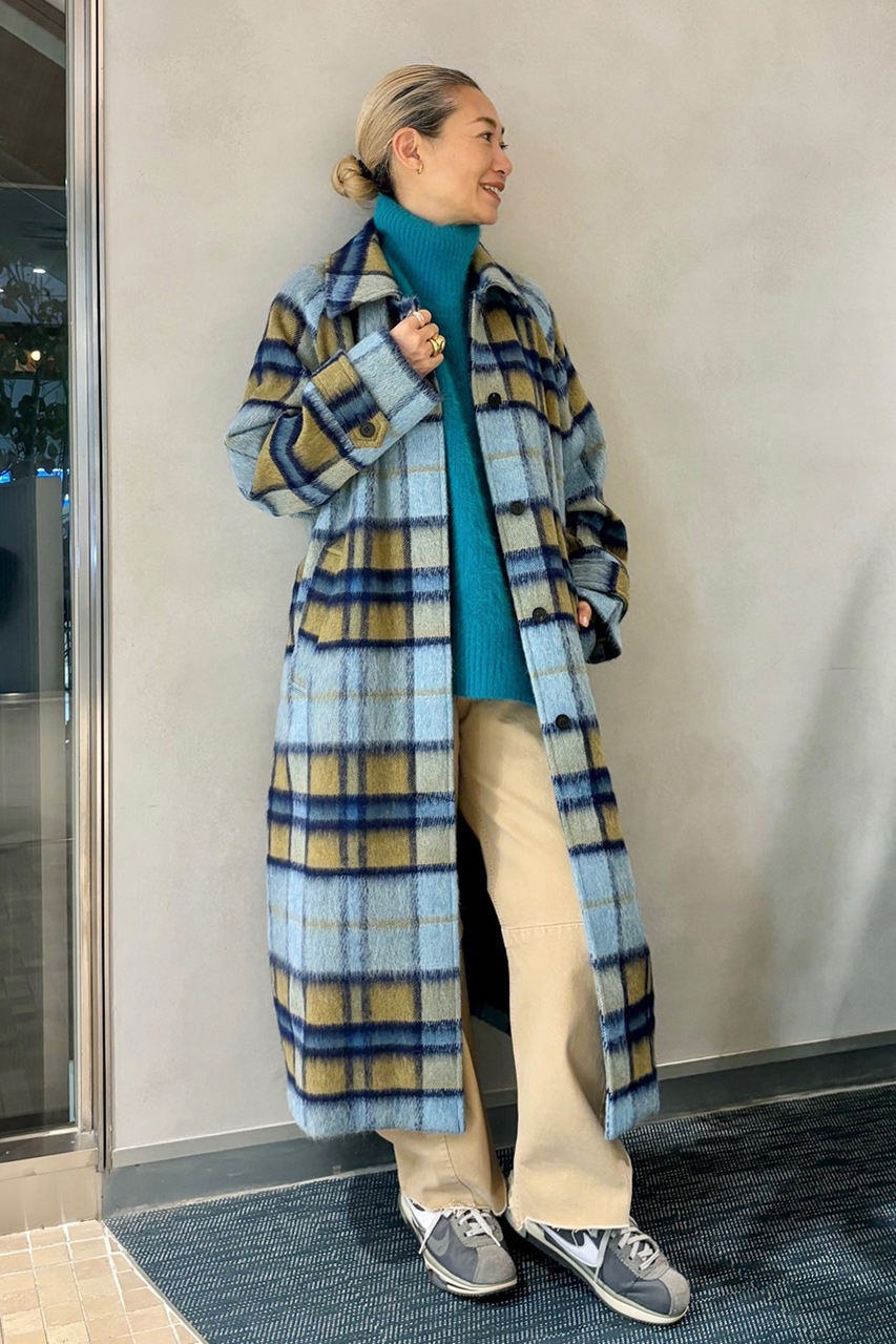 今年はスタイリングの主役になるシャギーチェックのステンカラーコートをセレクト。イタリア Nalya社のテキスタイルはインポートならではのスモーキーブルーのグラデーション×マスタードの配色が印象的。端正なステンカラーが生み出すハンサムな表情が◎。ベルトをギュッとしめてバックケープを際立たせた着こなしにトライして。