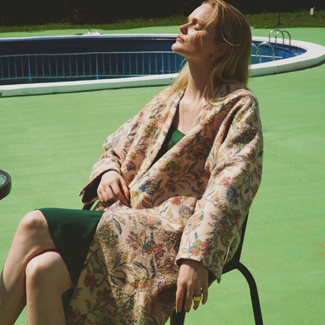 今シーズンのテーマである、クルーズ船のラウンジでくつろぐシーンからイメージしたガウンコート。オリエンタルなフラワーボタニカル柄が素敵。ループヤーンに繊細に輝くラメ糸を織り込んだあたたかみのある素材にプリントを施しました。チラッと見える裏地とリボンベルトのベロアがさりげないアクセントに。シンプルクリーンなインスタイルに、バサッとラフに羽織るのが気分。