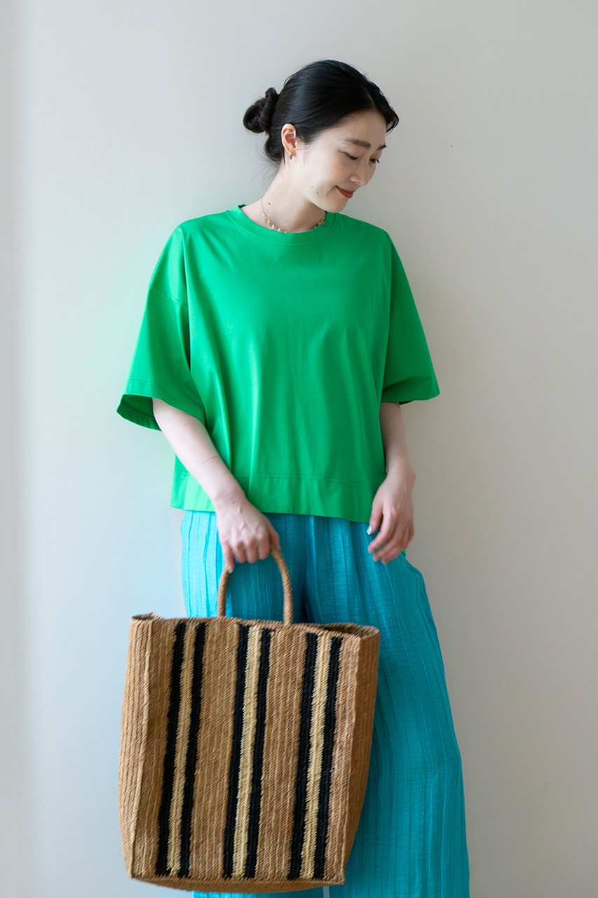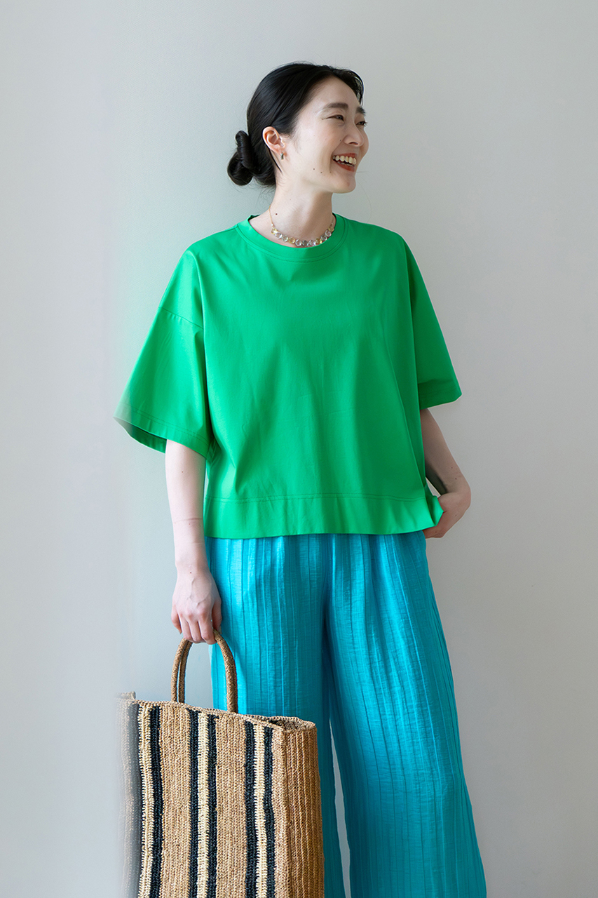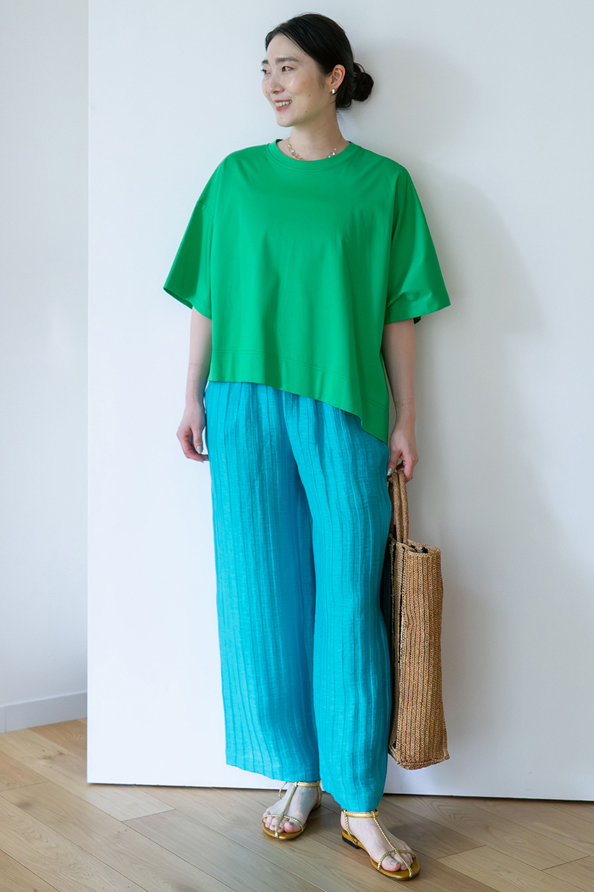 グリーンのカットソーに、ライトブルーのイージーパンツを合わせたプレイフルなカラー使い。寒色同士の組み合わせは、初夏のスタイルに爽やかな空気を運び込みます。首元には、透明感のあるストーンペンダントをさりげなく。ラフィアバッグを合わせて、大人のリゾートカジュアルが完成。(スタッフ身長165cm/着用サイズM)