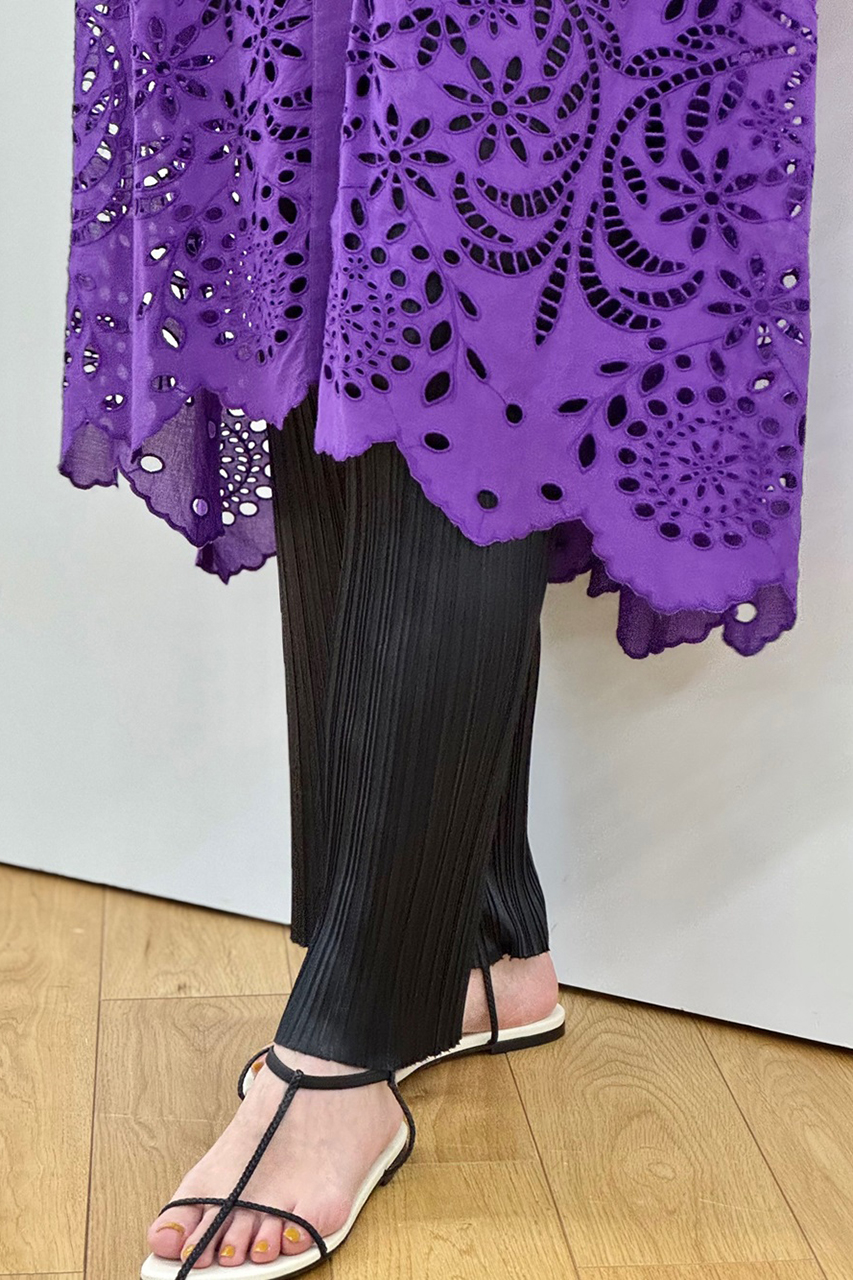 上品なのに気取らず、デイリーでもリゾートでも映える、そんなちょうどいい抜け感をまとえるのがパープルの魅力。カットワークレースを最大限際立たせるブラックのプリーツパンツは「ハウス オブ ロータス」のロングセラー。シワにならずにコンパクトにたためて、雨の日も気兼ねなく穿けるのがうれしいポイント。(スタッフ身長170cm/着用サイズM)