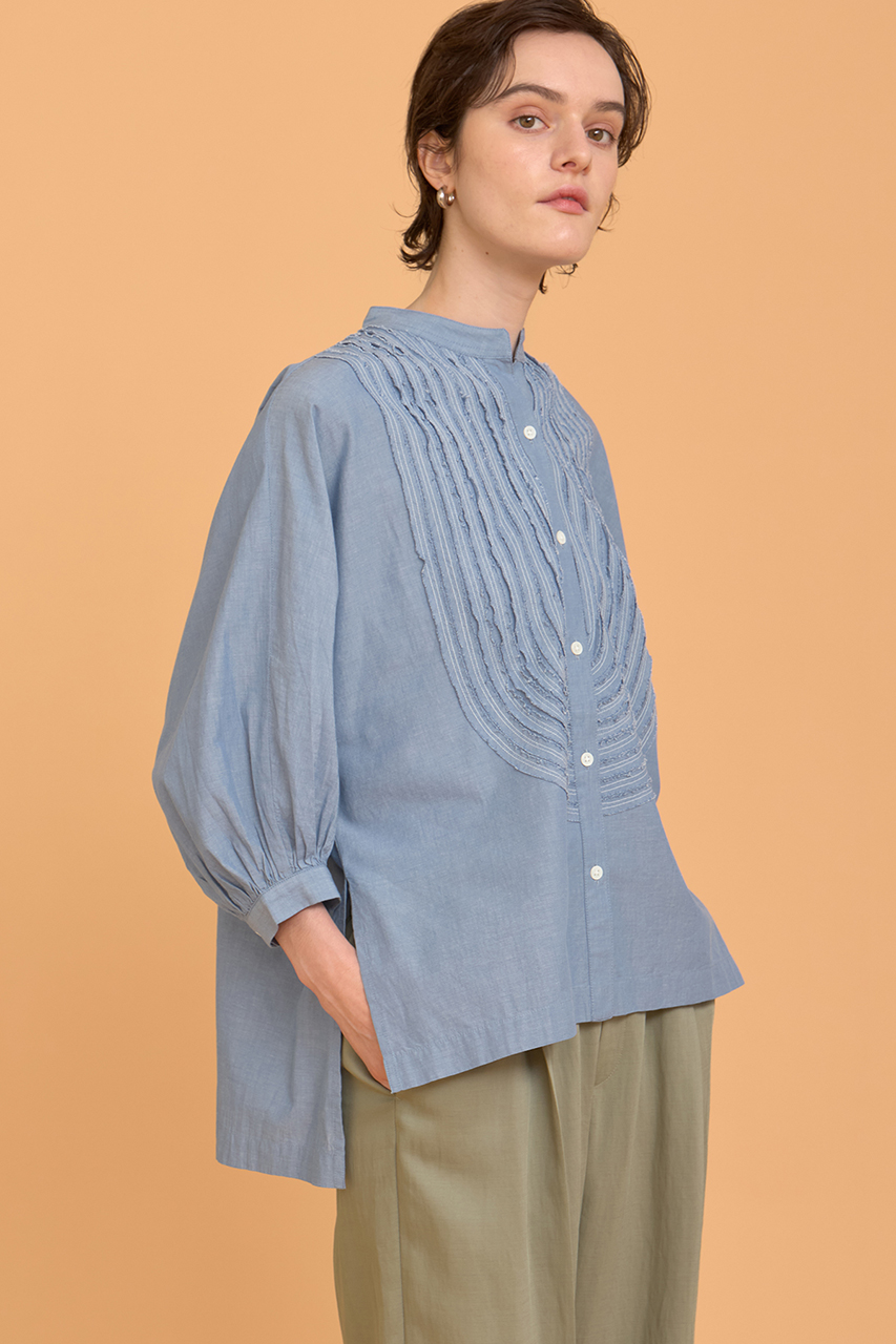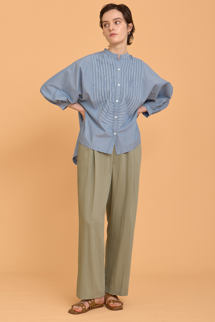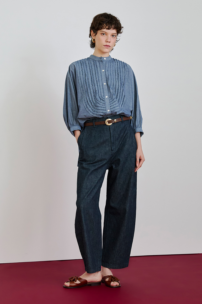 シャンブレー×デニムのレイヤード。ウエストはタックインしてカービーなラインを際立たせて。タテ糸にムラ糸を使用した国産デニムはスラックスのようなきちん感がありながらも、リラクシーなはき心地。