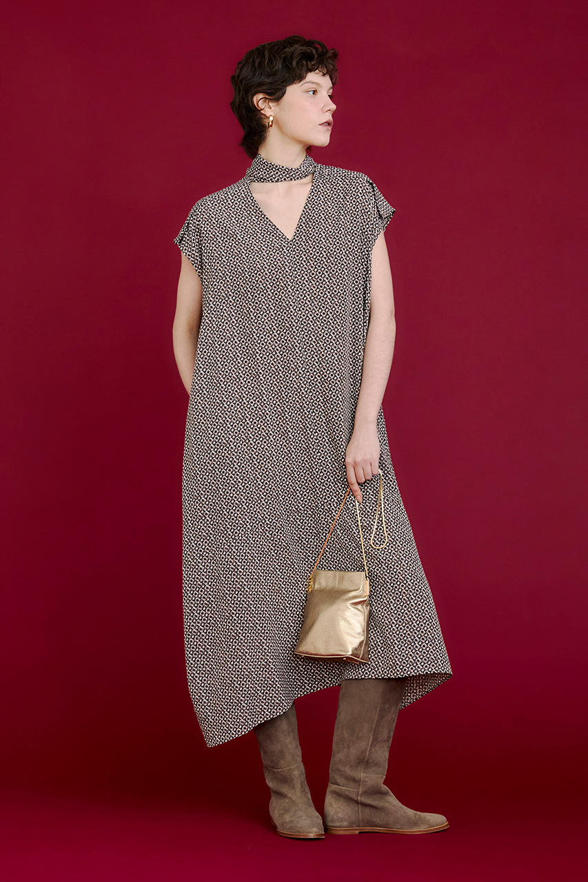 イギリスのヴィンテージ図案デザインからアレンジを加えた小紋柄をプリントしたボウタイ付きワンピース。クラシカルなボウタイとモダンなシルエットが新たな表情を生み出します。