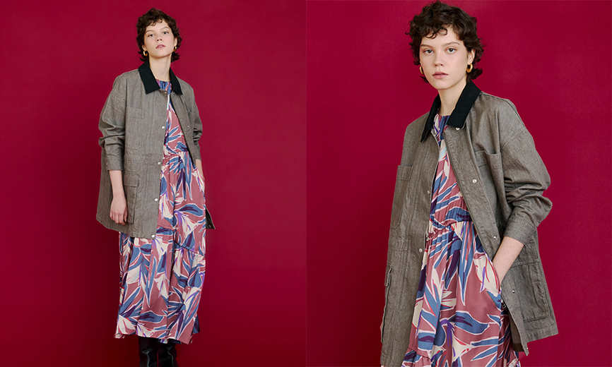続いて象徴的なアイテムとなるデニムフィールドジャケットやスタッズジレが登場し、「ハウス オブ ロータス」のシグネチャーであるワンピーススタイルをアップデート。今シーズンの新ベーシックカラーであるブラウンをベースに、ベリーやインディゴを組み合わせた色づかいにも注目です。