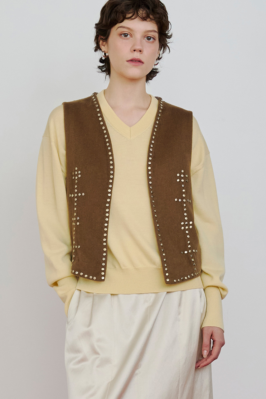 この秋、スタイリングの幅を広げてくれるスタッズづかいのニットジレ。コンパクトなシルエットでオーバーサイズなスタイルバランスを引き締めてくれます。フロントにはハリのあるウールフラノ、バックはウールニットを使用し、ジャケットやアウターのインナーとしてももたつかず、着やすい仕上がり。大人のボヘミアンスタイルが叶う一着です。