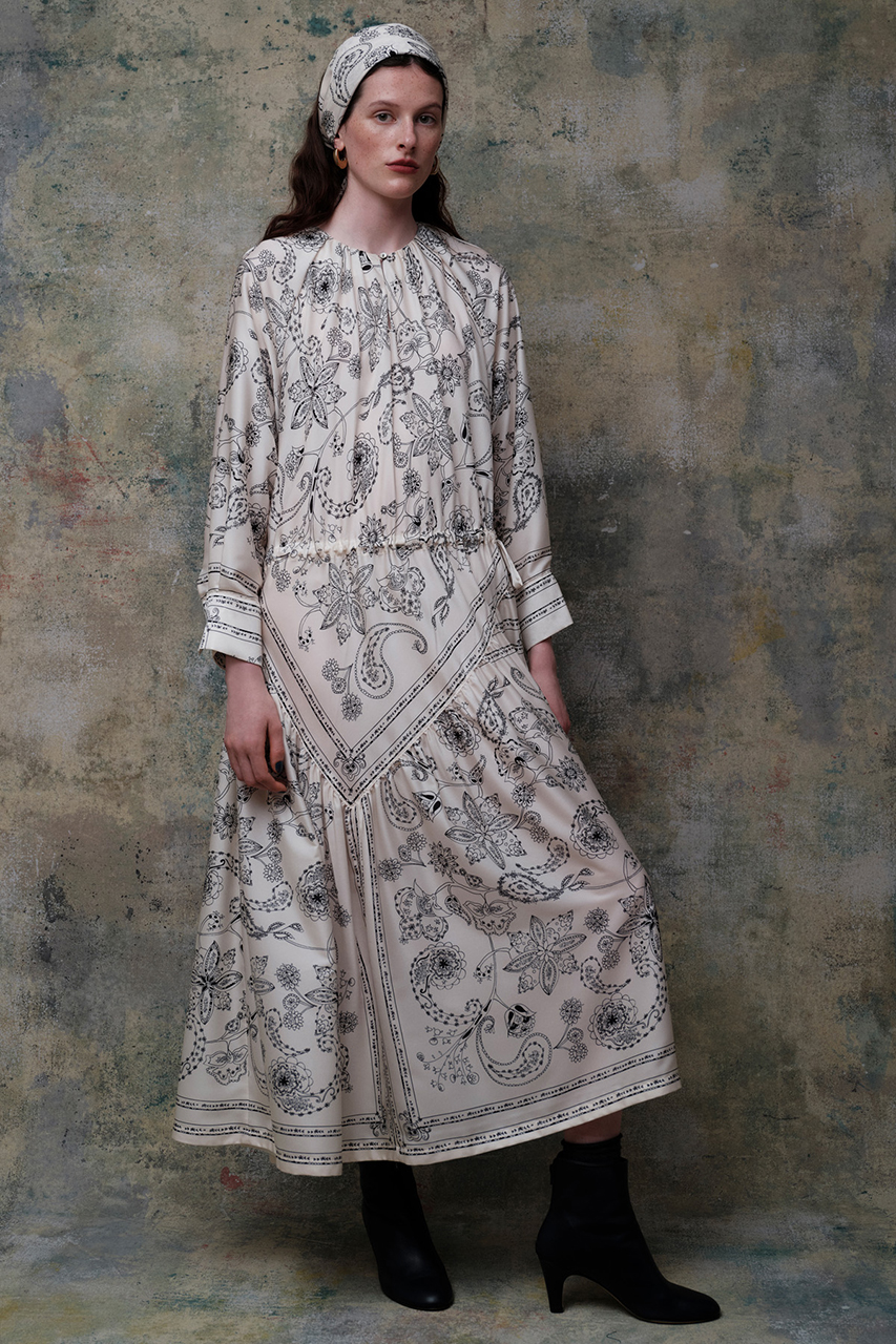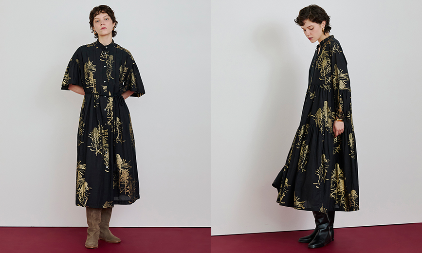 ユニークなブラシ状の花を咲かせるバンクシアをイメージしたハクプリントワンピース。大きなモチーフを配置することで華やかで洗練された印象に。軽やかな着心地の綿ローン素材で残暑の9月でもすぐに取り入れられます。繊細なピンタックを施したフレアスリーブとティアードシルエットの長袖の2型を展開。