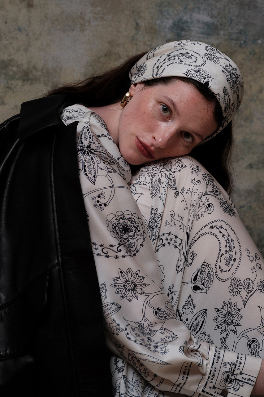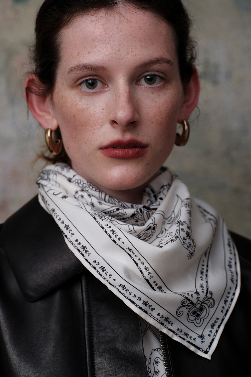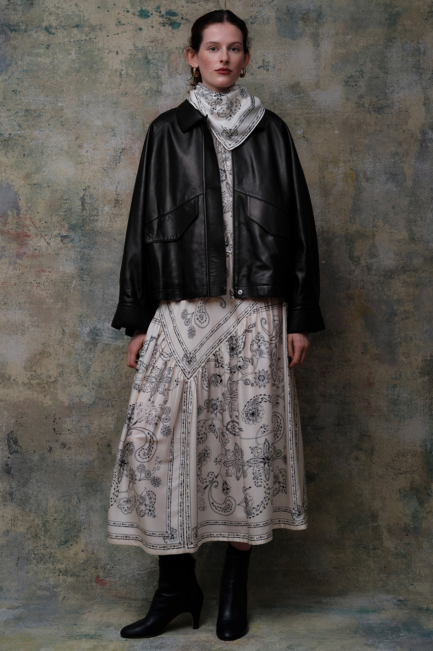繊細なタッチで描かれたペイズリーをスカーフ風にアレンジしたプリントワンピース。柄を最大限活かした贅沢なつくりで、どこかボヘミアンなムードが漂います。付属のスカーフは首元だけでなく、頭に巻いたり、様々なアレンジで楽しめます。フェミニンなワンピースにはレザーブルゾンを羽織って。しなやかなラムレザーを使用し、滑らかな質感と光沢が着こなしを格上げ。